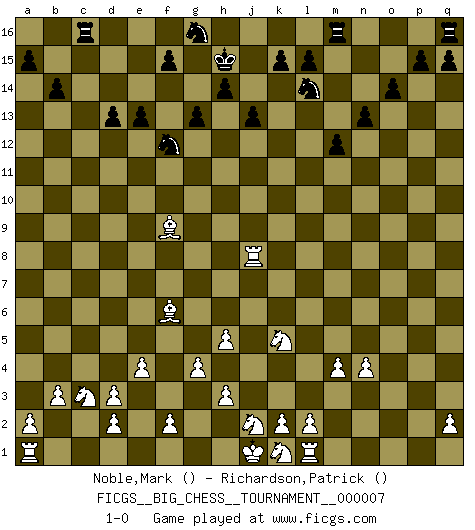 Last move : 1-0 2007 May 21 13:7:2 [Event "FICGS__BIG_CHESS__TOURNAMENT__000007"] [Site "FICGS"] [Date "2007.05.17"] [Round "1"] [White "Noble,Mark"] [Black "Richardson,Patrick"] [Result "1-0"] [WhiteElo ""] [BlackElo ""] 1.g2-g4 b15-b14 2.n2-n4 c16-b15 3.o2-o3 b16-c14 4.m2-m4 g15-g13 5.l1-o4 e15-e13 6.o1-g8 n15-n14 7.h1-d5 d15-d14 8.b2-b3 o16-g9 9.c1-b2 o15-o14 10.m1-m3 m15-m13 11.p1-n2 p16-n15 12.e2-e4 h16-f14 13.b2-d4 g9-k6 14.j2-h4 k6-h4 15.j3-h4 n14-n13 16.f1-c4 m13-m12 17.b1-c3 c14-d12 18.d5-c5 n15-l14 19.c5-c15 b15-j8 20.c15-c7 j14-j13 21.m3-j3 f14-f11 22.n2-l3 e16-c16 23.c7-j7 l16-o13 24.o4-j9 d12-e10 25.c4-a6 c16-c10 26.j7-j6 j8-k7 27.j6-l4 o13-g6 28.a6-e10 f11-g10 29.h4-h5 g6-j8 30.h2-j4 d14-d13 31.j4-h6 f16-a11 32.d4-f6 a11-f6 33.j9-f6 a16-c16 34.h6-j8 k7-j8 35.g8-f9 g10-p10 36.j3-j8 p10-p2 37.q1-l1 p2-o3 38.g1-j2 j15-g14 39.e1-e3 g14-f12 40.e10-d9 c10-d10 41.e3-d3 k16-j14 42.d9-j14 d10-d3 43.j14-h15 j16-h15 44.c2-d3 o3-o9 45.l4-k5 o9-k5 46.l3-k5 1-0 Follow this game move after move (download)A good player is always lucky. (Jose Raul Capablanca) Ein Schachgenie ist jemand der verdammt gut Schach spielt. (Jonathan Levitt) Siempre es mucho mejor sacrificar las piezas de tu oponente. (Savielly Tartakover) La vie et les Echecs sont tous les deux une lutte constante. (Lasker) When I took office, only high energy physicists had ever heard of what is called the World Wide Web... Now even my cat has its own page. (Bill Clinton, 1996)