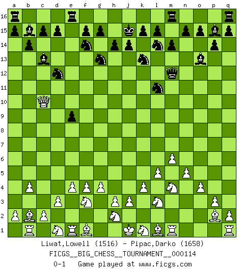Last move : 0-1 2018 September 18 22:56:58 [Event "FICGS__BIG_CHESS__TOURNAMENT__000114"] [Site "FICGS"] [Date "2018.09.05"] [Round "1"] [White "Liwat,Lowell"] [Black "Pipac,Darko"] [Result "0-1"] [WhiteElo "1516"] [BlackElo "1658"] 1.m2-m4 j15-k13 2.l2-l4 h15-g13 3.j2-l3 p15-p14 4.b1-c3 m15-m14 5.n2-n4 b15-b14 6.m4-m5 c16-b15 7.p1-o3 b16-c14 8.g2-g4 o16-p15 9.c3-d1 l16-o13 10.d2-d3 p16-o14 11.n4-n5 k16-l14 12.o3-m4 g16-f14 13.o2-o4 e15-e13 14.e2-e4 f16-c13 15.k2-k4 j16-h15 16.h1-k3 h16-m12 17.a1-b1 e13-e12 18.p2-p3 e12-e11 19.o1-p2 e11-e10 20.f2-f4 c14-e13 21.g1-f3 e13-f11 22.m5-m6 e10-e9 23.k3-c10 h15-j15 24.b2-b4 o14-m13 25.c1-b2 m13-l11 26.l4-l5 f11-d12 0-1 Follow this game move after move (download)I look one move ahead... the best ! (Siegbert Tarrasch) Ich möchte Schüler heranbilden, die das Vermögen haben, selbst zu denken und Kritik zu üben. (Emanuel Lasker) De todos mis libros Rusos, la defensa contiene y difunde el 'calor' mas grande que pudiese verse extraño al observar lo supremamente abstracto que el Ajedrez supuestamente es. (Vladimir Nabokov) Roi des jeux et jeu des rois, les échecs portent en eux un sentiment d'infini. Ils donnent à celui qui s'est efforcé d'en approfondir les arcanes l'impression de n'être pas à la mesure de l'homme; en fait, ils constituent un résumé de l'univers, un microcosme, et figurent cette grande échelle qui, dans les plans de la lumière descend jusqu'à la matière, qui des abîmes insondables remonte jusqu'en l'infini de Dieu. (Pyrame) There are two kinds of tragedy in this world, one is not getting what you want and the other is getting. (Lord of war)