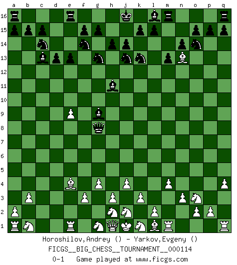 Last move : 0-1 2018 October 23 18:47:7 [Event "FICGS__BIG_CHESS__TOURNAMENT__000114"] [Site "FICGS"] [Date "2018.09.05"] [Round "1"] [White "Horoshilov,Andrey"] [Black "Yarkov,Evgeny"] [Result "0-1"] [WhiteElo ""] [BlackElo ""] 1.e2-e4 e15-e13 2.f1-c4 n15-n14 3.b2-b3 d15-d13 4.c1-b2 p16-o14 5.j3-j4 o16-g9 6.n2-n3 b16-c14 7.p1-o3 m15-m13 8.g2-g4 h15-g13 9.e4-e5 h16-h15 10.k2-k3 g16-f14 11.q2-q4 k16-l14 12.e5-e6 j15-k13 13.e6-e7 c16-k9 14.d2-d3 f16-c13 15.e7-e8 h15-f13 16.f2-f3 l14-j13 17.m2-m4 f13-a8 18.o1-g8 k9-h11 19.c4-d5 a8-c10 20.e8-e9 c10-c2 21.b2-n13 c2-d3 22.d5-e4 d3-d8 23.e4-h7 d8-a8 24.h7-e4 a8-g8 0-1 Follow this game move after move (download)That's what Chess is all about. One day you give your opponent a lesson, the next day he gives you one. (Bobby Fischer) Taktik ist was man tun muß, wenn etwas zu tun ist. Strategie ist was man tun muß, wenn nichts zu tun ist. (Savielly Grigorievitsch Tartakower) Hay dos clases de hombres: aquellos que se conforman en dejarse llevar por las circunstancias y que juegan barajas y aquellos decididos a controlar las circunstancias y que juegan al Ajedrez. (Mortimer Collins) Les Echecs sont affaire de jugement sensible. Savoir quand frapper et quand esquiver. (Fischer) Tree pose grows confidence. It roots me to this world. (Terri Guillemets)