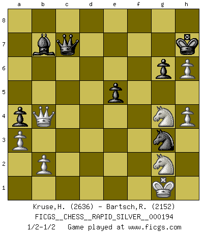 Last move : 1/2-1/2 2019 January 30 9:55:13 [Event "FICGS__CHESS__RAPID_SILVER__000194"] [Site "FICGS"] [Date "2018.09.06"] [Round "1"] [White "Kruse,Herbert"] [Black "Bartsch,Reinhard Andrea"] [Result "1/2-1/2"] [WhiteElo "2636"] [BlackElo "2152"] 1.Nf3 Nf6 2.g3 d5 3.Bg2 c6 4.O-O Bf5 5.d3 e6 6.Nh4 Bg4 7.h3 Bh5 8.f4 Nfd7 9.Qe1 Be7 10.Nf3 Na6 11.g4 Bg6 12.Nc3 Nb4 13.Qd2 f5 14.e3 Na6 15.Qe1 O-O 16.a3 Nc7 17.Bd2 a5 18.Rd1 Bd6 19.Kh1 a4 20.Nh4 Be8 21.Ne2 Be7 22.Nf3 Bg6 23.Qg3 c5 24.Qe1 Ra6 25.g5 b5 26.Ng3 Bd6 27.Nh4 Be8 28.e4 g6 29.c3 Nb6 30.Bc1 Bc6 31.Nf3 Nd7 32.Kg1 fxe4 33.dxe4 Bxf4 34.Bxf4 Rxf4 35.h4 Qe7 36.Nh2 Rxf1+ 37.Ngxf1 d4 38.cxd4 cxd4 39.Rxd4 e5 40.Rd1 Ne6 41.Ng4 Nf4 42.Nfe3 h5 43.gxh6 Nc5 44.Qb4 Kh7 45.Nf2 Ra7 46.Rd2 Rc7 47.Rc2 Bb7 48.Qxb5 Nxg2 49.Nxg2 Nxe4 50.Rxc7 Qxc7 51.Ng4 Ng3 52.Qb4 Ne2+ 53.Kf1 Ng3+ 54.Kg1 Ne2+ 55.Kf1 Ng3+ 56.Kg1 1/2-1/2 Reti Opening Kingside Castling by player White (move 4) Kingside Castling by player Black (move 15) This chess game ended in a draw. Follow this game move after move (download)If your opponent cannot do anything active, then don't rush the position; instead you should let him sit there, suffer, and beg you for a draw. (Jeremy Silman) Ich moechte nie einem Club beitreten, der Leute wie mich als Mitglieder aufnimmt. (Woody Allen) La maestría del Ajedrez consiste esencialmente en analizar posiciónes de Ajedrez con precisión. (Mikhail Botvinnik) Karpov est une pièce de musée. (Garry Kasparov) How many people work in NATO Headquarters ? - About half of them. (Dirk Stikker, NATO general secretary)
