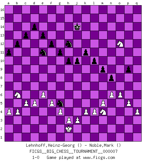 Last move : 1-0 2008 January 7 3:53:53 [Event "FICGS__BIG_CHESS__TOURNAMENT__000007"] [Site "FICGS"] [Date "2007.05.17"] [Round "1"] [White "Lehnhoff,Heinz-Georg"] [Black "Noble,Mark"] [Result "1-0"] [WhiteElo ""] [BlackElo ""] 1.j2-k4 g15-g13 2.b1-c3 p16-o14 3.m2-m4 m15-m13 4.e2-e4 l16-p12 5.n2-n4 n15-n14 6.p1-o3 b16-c14 7.d2-d4 e15-e13 8.f1-b5 f16-b12 9.h1-l4 l15-l13 10.l1-q6 h16-f14 11.l4-f9 d15-d14 12.c1-m10 j14-j13 13.h2-g4 f14-f9 14.o1-f9 c16-l8 15.k1-h2 o14-n12 16.m10-g5 f15-f13 17.o3-n5 k16-j14 18.g1-j2 j14-h12 19.m1-m3 k15-k13 20.f2-f4 l13-l12 21.g5-h6 a15-a13 22.f9-h11 l8-h11 23.b5-h11 g13-g12 24.h11-f9 o16-f8 25.h6-f8 b12-f8 26.c3-d5 c14-d12 27.m3-p3 o15-o13 28.e1-e3 b15-b13 29.g4-f6 c15-c13 30.h2-g4 j16-k15 31.f6-d7 f8-l13 32.c2-c4 b13-b12 33.q1-n1 h15-g13 34.j1-h2 g13-f11 35.g4-f6 f11-h10 36.f9-k5 k15-j14 37.c4-c5 h14-h13 38.l2-l4 g16-h14 39.k5-j4 a13-a12 40.e3-a3 a12-a11 41.g2-g4 f13-f12 42.f6-e8 h14-j12 43.a1-c1 j15-l14 44.j4-h5 q15-q13 45.c1-c4 p15-p13 46.c4-b4 e16-e14 47.p3-p6 a16-a15 48.j2-h4 l14-k12 49.h5-j4 k12-h11 50.p6-c6 h12-f11 51.k4-j6 k13-k12 52.n1-n3 l12-l11 53.k2-k4 n12-m10 54.n3-p3 m13-m12 55.e8-c9 n14-n13 56.e4-e5 n13-n12 57.d5-f6 m12-m11 58.a3-a7 j12-g11 59.j6-g7 m10-k9 60.m4-m5 j13-j12 61.q6-o8 j14-k13 62.f6-e8 l13-n11 63.h2-g3 n11-m10 64.o8-m10 k9-m10 65.c6-q6 k12-k11 66.b4-b6 l11-l10 67.d7-f8 m10-k9 68.g7-h9 g11-h9 69.f8-h9 h13-h12 70.a7-q7 j12-j11 71.h9-f10 h11-f10 72.e8-f10 k13-j12 73.j4-h5 q16-p16 74.b6-o6 m16-m13 75.h5-p12 q13-p12 76.q7-q16 a15-p15 77.q16-p16 p15-p16 78.q6-q15 k9-m10 79.p3-q3 m10-o11 80.q3-q14 p16-p14 81.q14-p14 e14-p14 82.o6-q6 m13-m14 83.q15-j15 m14-j14 84.q6-q15 d12-f13 85.n5-o7 p14-q14 86.q15-q14 j14-j15 87.f10-e12 j15-c15 88.e12-f10 f11-d12 89.a2-a4 g12-g11 90.f10-h9 c15-h15 91.h9-k8 h15-h14 92.q14-q15 h14-n14 93.k8-m7 o13-o12 94.q2-q4 n12-n11 95.m7-n9 o11-n9 96.o7-n9 m11-m10 97.n9-o7 n11-n10 98.p2-p4 n10-n9 99.o2-o4 n14-n10 100.o4-o5 n10-o10 101.o7-p5 o10-o8 102.c9-d7 o8-d8 103.e5-e6 d8-d10 104.h4-f3 d10-b10 105.d7-b6 b10-e10 106.f4-f5 e10-e8 107.q15-q13 p12-p11 108.p5-o3 e8-j8 109.g3-h2 j8-n8 110.n4-n5 n8-p8 111.o3-p5 h10-k9 112.q13-p13 p8-q8 113.p5-o3 q8-p8 114.p4-p5 p8-o8 115.o5-o6 m10-m9 116.p13-n13 n9-n8 117.n5-n6 o8-o10 118.f3-e5 k9-h8 119.b2-b4 j11-j10 120.d4-d5 h12-h11 121.e5-d7 j12-j11 122.d7-e9 h8-f9 123.e9-g8 h11-h10 124.g8-h6 f13-e11 125.h6-k7 f9-g7 126.n13-n14 d12-f13 127.k7-l9 g7-j6 128.n14-j14 j11-k12 129.l9-m11 k12-k13 130.m11-o10 k13-j14 131.o10-m11 f13-h12 132.m11-o12 j6-g5 133.o12-q13 p11-p10 134.q13-o12 p10-p9 135.o3-m4 1-0 Follow this game move after move (download)Modern Chess is too much concerned with things like Pawn structure. Forget it, Checkmate ends the game. (Nigel Short) Wenn Schach ein enormer Dschungel ist, der seine Myriaden von Geheimnissen nicht preisgeben will, dann sind Computer die Kettensägen einer gewaltigen ökologisch unsensiblen Nutzholzfirma. (Nigel Short) Coloca el contenido de las piezas del Ajedrez en un sombrero, agitalo vigorosamente, arrojalas en un tablero desde una altura de 30 centimetros y así obtendras el estilo de Steinitz. (H. E. Bird) Le génie consiste à savoir transgresser les règles au moment opportun. (Teichmann) History is a gallery of pictures in which there are few originals and many copies. (Alexis de Tocqueville)