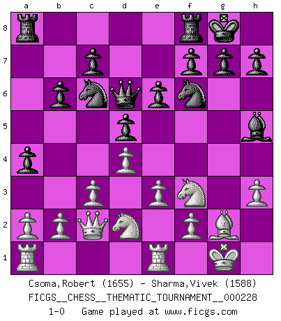 Last move : 1-0 2018 December 6 12:34:13 [Event "FICGS__CHESS__THEMATIC_TOURNAMENT__000228"] [Site "FICGS"] [Date "2018.09.07"] [Round "1"] [White "Csoma,Robert"] [Black "Sharma,Vivek"] [Result "1-0"] [WhiteElo "1655"] [BlackElo "1588"] 1.d4 d5 2.g4 Bxg4 3.h3 Bh5 4.Bg2 e6 5.Nf3 Nc6 6.Bf4 Nf6 7.e3 Bb4+ 8.c3 Bd6 9.Bxd6 Qxd6 10.Nbd2 O-O 11.Qb3 b6 12.O-O a5 13.Rfe1 a4 14.Qc2 1-0 This chess game has been lost on time (started : 2018.09.07 16:41:28) Queen's pawn game Kingside Castling by player Black (move 10) Kingside Castling by player White (move 12) Player White won this chess game. Follow this game move after move (download)I have always a slight feeling of pity for the man who has no knowledge of Chess. (Siegbert Tarrasch) Herr Iljumschinow ist ein etwas merkwürdiger Geschäftsmann: Er arbeitet zusammen mit Leuten wie Muammar al-Gaddafi; früher ist das Saddam Hussein gewesen. (Joel Lautier) El Ajedrez por encima de todo... ¡es una pelea!. (Emanuel Lasker) Psychologiquement, tu dois avoir confiance en toi même, mais cette confiance doit être basée sur des faits. (Robert Fischer) Ah, beer! The cause of, and the solution to, all of life's problems. (Homer Simpson)