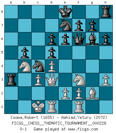 Last move : 0-1 2018 November 20 23:5:21 [Event "FICGS__CHESS__THEMATIC_TOURNAMENT__000228"] [Site "FICGS"] [Date "2018.09.07"] [Round "1"] [White "Csoma,Robert"] [Black "Aahlad,Yeturu"] [Result "0-1"] [WhiteElo "1655"] [BlackElo "2072"] 1.d4 d5 2.g4 Bxg4 3.h3 Bh5 4.Bg2 e6 5.Nf3 Nc6 6.Bf4 Bd6 7.Qd2 h6 8.Nc3 Qf6 9.Bxd6 cxd6 10.Nb5 Rd8 11.O-O-O a6 12.Nc3 Nge7 13.Rhf1 b5 14.a3 Rb8 15.Na2 a5 16.b4 Ra8 17.Kb2 axb4 18.Nxb4 Na5 19.Qd3 Nc4+ 20.Kc1 Rxa3 21.c3 Bg6 0-1 Queen's pawn game Queenside Castling by player White (move 11) Player Black won this chess game. Follow this game move after move (download)By this measure (on the gap between Fischer & his contemporaries), I consider him the greatest world champion. (Garry Kasparov) Ohne Leiden bildet sich kein Charakter. (Ernst Freiherr von Feuchtersleben) Aquel que toma al Peón de Caballo de la Reina, se pasará la noche a dormir en la calle. (Anónimo) Je crois qu'il existe des manières très spécifiques de jouer efficacement contre une machine. Evidemment, nous n'avons aucune chance en technique pure, parce que l'ordinateur calcule de manière parfaite. Mais lorsque nous faisons appel à notre cerveau, en utilisant l'intuition et la compréhension, alors nous restons beaucoup plus forts. (Anatoli Karpov) To steal ideas from one person is plagiarism. To steal from many is research. (Unknown)