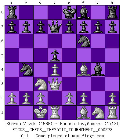 Last move : 0-1 2018 November 2 21:36:30 [Event "FICGS__CHESS__THEMATIC_TOURNAMENT__000228"] [Site "FICGS"] [Date "2018.09.07"] [Round "1"] [White "Sharma,Vivek"] [Black "Horoshilov,Andrey"] [Result "0-1"] [WhiteElo "1588"] [BlackElo "1713"] 1.d4 d5 2.g4 Bxg4 3.Nc3 Nf6 4.Qd3 Qd7 5.Bf4 Nc6 6.O-O-O Nb4 0-1 This chess game has been lost on time (started : 2018.09.07 16:41:28) Queen's pawn game Queenside Castling by player White (move 6) Player Black won this chess game. Follow this game move after move (download)Of Chess it has been said that life is not long enough for it, but that is the fault of life, not Chess. (William Ewart Napier) Im Schach gewinnt jeder. Hat man Freunde am Spiel - und das ist die Hauptsache - ist auch der Verlust einer Partie kein Unglück. (David Bronstein) ¿Esta Bobby Fischer algo cuerdo?. (Salo Flohr) Aux échecs, l'amour-propre est satisfait quand on remporte la victoire, mais il n'y a pas de honte à être battu. (Benjamin Franklin) Wisdom doesn't necessarily come with age. Sometimes age just shows up all by itself. (Tom Wilson)