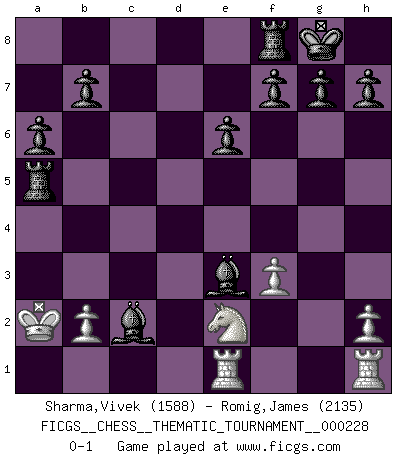 Last move : 0-1 2018 September 13 18:59:6 [Event "FICGS__CHESS__THEMATIC_TOURNAMENT__000228"] [Site "FICGS"] [Date "2018.09.07"] [Round "1"] [White "Sharma,Vivek"] [Black "Romig,James"] [Result "0-1"] [WhiteElo "1588"] [BlackElo "2135"] 1.d4 d5 2.g4 Bxg4 3.Nc3 e6 4.Qd3 c5 5.Bd2 Nf6 6.dxc5 Bxc5 7.f3 Bh5 8.O-O-O Nc6 9.Qb5 Bb6 10.e4 O-O 11.Be2 a6 12.Qa4 Nd4 13.exd5 Bg6 14.Be3 Nxe2+ 15.Ngxe2 Bxe3+ 16.Kb1 Nxd5 17.Qb3 Nxc3+ 18.Qxc3 Qb6 19.a4 Rac8 20.a5 Qc5 21.Qxc5 Rxc5 22.Ka2 Bxc2 23.Rde1 Rxa5+ 0-1 Queen's pawn game Queenside Castling by player White (move 8) Kingside Castling by player Black (move 10) Player Black won this chess game. Follow this game move after move (download)Robert Fischer is a law unto himself. (Larry Evans) Ich suche im Schach immer etwas Eigenes. Riskantes Spiel im Stile schachlicher Musketiere ist nicht meine Sache, auch wenn es vielen Freunden scharfer Wendungen gefällt. (Anatoly Karpov) No es una movida, aún la mejor movida que tu debas buscar, sino un plan comprensible. (Eugene Znosko-Borovsky) Mon pion favori sur ma case favorite ! Bronstein en parlant d'un coup de pion en h5 quand il avait les Noirs. The Internet is so big, so powerful and pointless that for some people it is a complete substitute for life. (Andrew Brown)