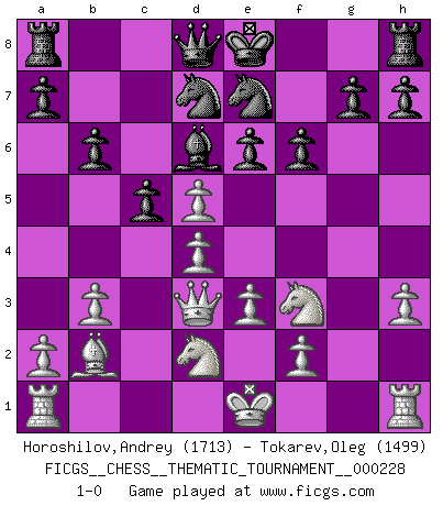 Last move : 1-0 2018 December 9 0:55:54 [Event "FICGS__CHESS__THEMATIC_TOURNAMENT__000228"] [Site "FICGS"] [Date "2018.09.07"] [Round "1"] [White "Horoshilov,Andrey"] [Black "Tokarev,Oleg"] [Result "1-0"] [WhiteElo "1713"] [BlackElo "1499"] 1.d4 d5 2.g4 Bxg4 3.Nf3 f6 4.Nbd2 e6 5.e3 Bd6 6.h3 Bh5 7.c4 b6 8.b3 Ne7 9.Bb2 Nd7 10.Qc2 Bg6 11.Bd3 c5 12.cxd5 Bxd3 13.Qxd3 1-0 This chess game has been lost on time (started : 2018.09.07 16:41:28) Queen's pawn game Player White won this chess game. Follow this game move after move (download)Many Chess players were surprised when after the game, Fischer quietly explained: 'I had already analyzed this possibility' in a position which I thought was not possible to foresee from the opening. (Mikhail Tal) Matt entspricht nicht immer den Tatsachen. (Savielly Grigorievitsch Tartakower) Cada Peón es potencialmente una Reina. (James Mason) Tout change constamment, y compris dans le monde des Echecs. (Botvinnik) The quality of decision is like the well-timed swoop of a falcon which enables it to strike and destroy its victim. (Sun Tzu)