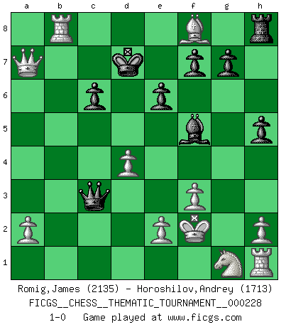 Last move : 1-0 2018 September 27 18:24:14 [Event "FICGS__CHESS__THEMATIC_TOURNAMENT__000228"] [Site "FICGS"] [Date "2018.09.07"] [Round "1"] [White "Romig,James"] [Black "Horoshilov,Andrey"] [Result "1-0"] [WhiteElo "2135"] [BlackElo "1713"] 1.d4 d5 2.g4 Bxg4 3.Bg2 Nf6 4.c4 Nc6 5.cxd5 Nxd5 6.Nc3 Nxc3 7.bxc3 e6 8.Rb1 Rb8 9.Rxb7 Qd7 10.Bxc6 Qxc6 11.Rxb8+ Ke7 12.f3 Bf5 13.Ba3+ Kd7 14.Bxf8 Qxc3+ 15.Kf2 h5 16.Qa4+ c6 17.Qxa7+ 1-0 Queen's pawn game Player White won this chess game. Follow this game move after move (download)One doesn't have to play well, it's enough to play better than your opponent. (Siegbert Tarrasch) Den Ruhm habe ich schon, jetzt brauche ich noch das Geld. (Wilhelm Steinitz) El juego del Ajedrez no es solamente una diversión quieta; algunas cualidades muy valuables de la mente se pueden adquirir y cultivar con el, como convertirlos en habitos disponibles para toda ocasión; ya que la vida es algo así como el Ajedrez. (Benjamin Franklin) La conception d'un plan est le processus par lequel un joueur exploite les avantages de sa position tout en s'efforçant d'en réduire au minimum les inconvénients. Afin de garantir le succès, un plan doit toujours se fonder sur un diagnostic objectif des particularités d'une position. La conception d'un plan est d'autant plus difficile que la position est équilibrée, et grandement facilitée lorsqu'il n'existe qu'un seul plan susceptible de répondre aux exigences de la position. (Harry Golombek) There is a computer disease that anybody who works with computers knows about. It's a very serious disease and it interferes completely with the work. The trouble with computers is that you 'play' with them ! (Richard P. Feynman)