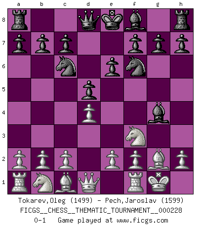 Last move : 0-1 2018 November 23 23:34:6 [Event "FICGS__CHESS__THEMATIC_TOURNAMENT__000228"] [Site "FICGS"] [Date "2018.09.07"] [Round "1"] [White "Tokarev,Oleg"] [Black "Pech,Jaroslav"] [Result "0-1"] [WhiteElo "1499"] [BlackElo "1599"] 1.d4 d5 2.g4 Bxg4 3.Bg2 e6 4.Nf3 Nc6 5.O-O Nf6 0-1 This chess game has been lost on time (started : 2018.09.07 16:41:28) Queen's pawn game Kingside Castling by player White (move 5) Player Black won this chess game. Follow this game move after move (download)You must take your opponent into a deep dark forest where 2+2=5, and the path leading out is only wide enough for one. (Mikhail Tal) Auf Remis zu spielen ist gewissermaßen ein Verbrechen gegen das Schachspiel. (Mikhail Nekhemyevich Tal) Aquel que ve no otra dirección en el juego que la de dar Jaque Mate a su oponente, nunca será un buen jugador de Ajedrez. (Euwe) Les échecs sont un jeu par leur forme, un art par leur essence et une science par sa difficulté d'acquisition. Ils peuvent vous procurer autant de plaisir qu'un bon livre ou une belle musique, mais vous n'aurez une réelle joie que si vous arrivez à bien jouer. (Tigran Petrosian) Art is the triumph over chaos. (John Cheever)