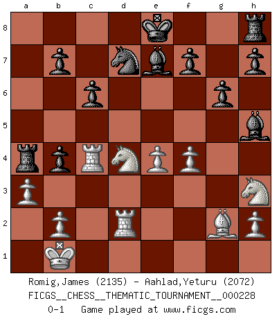 Last move : 0-1 2019 January 19 18:39:5 [Event "FICGS__CHESS__THEMATIC_TOURNAMENT__000228"] [Site "FICGS"] [Date "2018.09.07"] [Round "1"] [White "Romig,James"] [Black "Aahlad,Yeturu"] [Result "0-1"] [WhiteElo "2135"] [BlackElo "2072"] 1.d4 d5 2.g4 Bxg4 3.Bg2 e6 4.c4 c6 5.Qb3 Qb6 6.Nc3 Nf6 7.f3 Bh5 8.Qxb6 axb6 9.cxd5 Nxd5 10.Nh3 Nb4 11.Kd1 Bg6 12.e4 Nd7 13.a3 e5 14.Ne2 Nd3 15.Kc2 Nxc1 16.Raxc1 b5 17.f4 exd4 18.Nxd4 Ra4 19.Rhd1 Bh5 20.Rd2 g6 21.Kb1 b4 22.Rc4 Be7 0-1 Queen's pawn game Player Black won this chess game. Follow this game move after move (download)Via the squares on the chessboard, the Indians explain the movement of time and the age, the higher influences which control the world and the ties which link Chess with the human soul. (Al-Masudi) Ein Großmeister muß tausende Partien in seinem Kopf speichern, denn diese sind für Ihn, was die Worte der Muttersprache für gewöhnliche Leute sind, oder Noten für Musiker... (Garry Kasparov) No hay precio que sea tan grande por la cabellera del Rey enemigo. (Koblentz) Ce qui caractérise les parties de combat, c'est que si le défenseur a constamment de difficiles problèmes à résoudre, l'attaquant doit chercher sans relâche de nouvelles possibilités d'attaque. (Koblentz) The arrogant army will lose certainly the battle. (Chinese proverb)