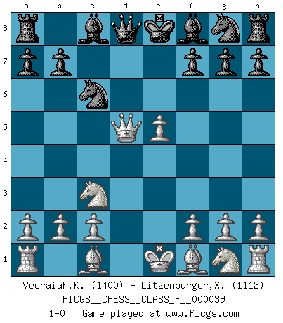 Last move : 1-0 2007 July 6 10:0:15 [Event "FICGS__CHESS__CLASS_F__000039"] [Site "FICGS"] [Date "2007.05.18"] [Round "1"] [White "Veeraiah,Karuppaiah"] [Black "Litzenburger,Xavier"] [Result "1-0"] [WhiteElo "1400"] [BlackElo "1112"] 1.e4 e5 2.d4 d5 3.dxe5 c6 4.exd5 cxd5 5.Nc3 Nc6 6.Qxd5 1-0 This chess game has been lost on time (started : 2007.05.18 8:47:38) King's pawn game Player White won this chess game. Follow this game move after move (download)Checkers is for tramps. (Paul Morphy) Man wirke der falschen Auffassung entgegen, als ob jeder Zug Unmittelbares zu leisten habe; auch Werte- und Ruhezüge haben ihre Existenzberechtigung. (Aaron Nimzowitsch) En el Ajedrez, cuando menos, el valiente hereda la tierra. (Edmar Mednis) Psychologiquement, tu dois avoir confiance en toi même, mais cette confiance doit être basée sur des faits. (Robert Fischer) The best weapon against an enemy is another enemy. (Friedrich Nietzsche)