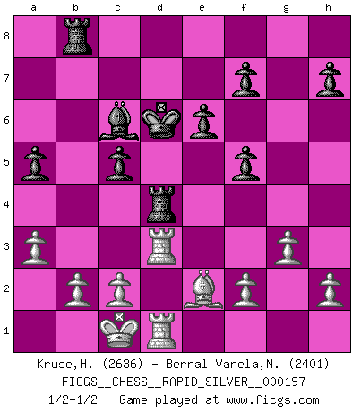 Last move : 1/2-1/2 2018 October 6 1:53:56 [Event "FICGS__CHESS__RAPID_SILVER__000197"] [Site "FICGS"] [Date "2018.09.08"] [Round "1"] [White "Kruse,Herbert"] [Black "Bernal Varela,Nelson"] [Result "1/2-1/2"] [WhiteElo "2636"] [BlackElo "2401"] 1.e4 e6 2.d4 d5 3.Nc3 Nf6 4.Bg5 dxe4 5.Nxe4 Be7 6.Nxf6+ Bxf6 7.Bxf6 Qxf6 8.Nf3 O-O 9.Qd3 Rd8 10.O-O-O c5 11.Qe4 Nc6 12.Bd3 Qh6+ 13.Kb1 Nxd4 14.Rhe1 a5 15.a3 Nxf3 16.Qxf3 Bd7 17.Qxb7 Qf6 18.Qe4 Rab8 19.Qe5 Bc6 20.Qxf6 gxf6 21.g3 Rd4 22.Re3 Kf8 23.Kc1 Ke7 24.Be2 f5 25.Rc3 Kd6 26.Rcd3 1/2-1/2 French : Burn variation Kingside Castling by player Black (move 8) Queenside Castling by player White (move 10) This chess game ended in a draw. Follow this game move after move (download)Man is a frivolous, a specious creature, and like a Chess player, cares more for the process of attaining his goal than for the goal itself. (Dostoyevsky) Es ist wirklich schade, dass so viele Schachspieler nicht auf ihr Äußeres achten! (Alexandra Kosteniuk) Si un gobernante no entiende al Ajedrez, ¿como puede governar él un reinado?. (El Rey Khusros II) Il vaut mieux sacrifier les pièces de l'adversaire. (Xavier Tartacover) Indecision is the key to flexibility. (Unknown)