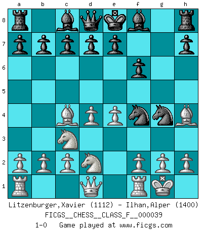 Last move : 1-0 2007 June 27 21:1:6 [Event "FICGS__CHESS__CLASS_F__000039"] [Site "FICGS"] [Date "2007.05.18"] [Round "1"] [White "Litzenburger,Xavier"] [Black "Ilhan,Alper"] [Result "1-0"] [WhiteElo "1112"] [BlackElo "1400"] 1.e4 Nh6 2.Nf3 Na6 3.Bc4 Nc5 4.Nc3 Ng4 5.d4 Ne6 6.O-O g5 7.Bxg5 f6 8.Bh4 Nf4 9.Nd2 1-0 This chess game has been lost on time (started : 2007.05.18 8:47:38) King's pawn Opening Kingside Castling by player White (move 6) Player White won this chess game. Follow this game move after move (download)Chess is so inspiring that I do not believe a good player is capable of having an evil thought during the game. (Wilhelm Steinitz) Die größte Kunst beim Schach besteht darin dem Gegner nicht zu zeigen was er tun kann. (Garry Kasparov) Preferería tener un Peón que un dedo. (Reuben Fine) Botvinnik disait en comparant les échecs à la musique: Il existe une science dont le but est l'étude de l'acoustique et des sons. Mais il y a aussi un art qui se sert de l'océan des sons : c'est la musique. De toute évidence, il en est de même pour la pensée. La logique est l'étude des lois de la réflexion et les échecs reflètent, en tant qu'art, le côté logique de la réflexion, sous la forme d'images artistiques... Extrait de Fischer - Spassky, Reykjavik 1972 par Alexander & F. Wyndham (Ed. Solar), p 37. When it is a question of money, everybody is of the same religion. (Voltaire)