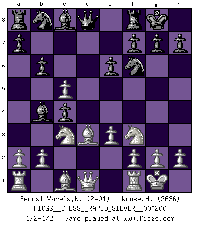 Last move : 1/2-1/2 2018 September 17 23:21:54 [Event "FICGS__CHESS__RAPID_SILVER__000200"] [Site "FICGS"] [Date "2018.09.08"] [Round "2"] [White "Bernal Varela,Nelson"] [Black "Kruse,Herbert"] [Result "1/2-1/2"] [WhiteElo "2401"] [BlackElo "2636"] 1.d4 Nf6 2.c4 e6 3.Nc3 Bb4 4.e3 O-O 5.Bd3 d5 6.Nf3 c5 7.O-O b6 8.dxc5 dxc4 1/2-1/2 Nimzo-Indian : 4.e3 O-O, 5.Bd3 d5 Kingside Castling by player Black (move 4) Kingside Castling by player White (move 7) This chess game ended in a draw. Follow this game move after move (download)Mistrust is the most necessary characteristic of the Chess player. (Siegbert Tarrasch) Die Arbeit ist etwas Unnatürliches. Die Faulheit allein ist göttlich. (Anatole France) No hay precio que no valga la pena por la cabellera del Rey enemigo. (Koblentz) Les pièces de l'échiquier étaient impitoyables. Elles le retenaient, elles l'absorbaient. Il y avait de l'horreur en cela, mais aussi une harmonie unique. Car, qu'y a-t-il dans le monde, à part les échecs ? (V. Nabokov) Perhaps the current trend of many chess professionals taking up the more lucrative pastime of poker is not a wholly negative one. It may not be too late for humans to relearn how to take risks in order to innovate and thereby maintain the advanced lifestyles we enjoy. And if it takes a poker-playing supercomputer to remind us that we can't enjoy the rewards without taking the risks, so be it. (The Chess Master and the Computer, by Garry Kasparov - 2010)