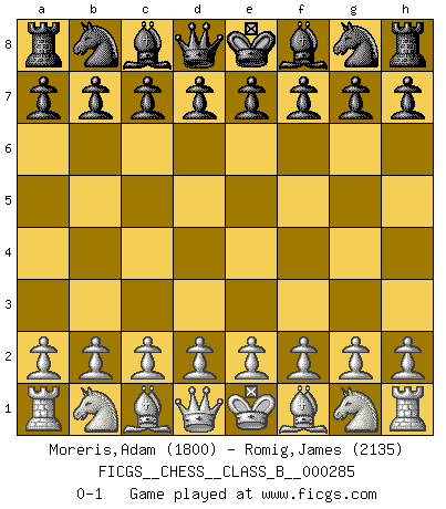 Last move : 0-1 2018 October 19 9:30:57 [Event "FICGS__CHESS__CLASS_B__000285"] [Site "FICGS"] [Date "2018.09.09"] [Round "1"] [White "Moreris,Adam"] [Black "Romig,James"] [Result "0-1"] [WhiteElo "1800"] [BlackElo "2135"] 0-1 This chess game has been lost on time (started : 2018.09.09 2:52:21) Player Black won this chess game. Follow this game move after move (download)Personally, I rather look forward to a computer program winning the world Chess Championship. Humanity needs a lesson in humility. (Richard Dawkings) Ihnen, Herr Lasker, habe ich nur drei Worte zu sagen: Schach und matt. (Siegbert Tarrasch) El Ajedrez es un regaderazo frío para la mente. (Sir John Simon) Les Cavaliers se révèlent fort utiles dans les positions fermées. D'habitude, les Fous sont un peu plus forts que les Cavaliers dans les positions ouvertes. Qu'on le veuille ou non, il restera toujours des exceptions ! Train yourself to let go of everything you fear to lose. (Master Yoda in Star Wars ep.3)