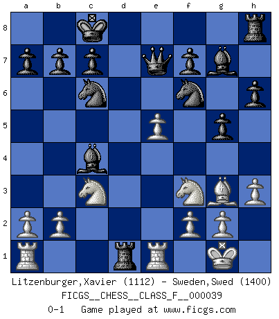 Last move : 0-1 2007 May 29 22:45:48 [Event "FICGS__CHESS__CLASS_F__000039"] [Site "FICGS"] [Date "2007.05.18"] [Round "1"] [White "Litzenburger,Xavier"] [Black "Sweden,Swed"] [Result "0-1"] [WhiteElo "1112"] [BlackElo "1400"] 1.e4 e5 2.Nf3 Nc6 3.Bc4 d6 4.c3 Bg4 5.d4 exd4 6.cxd4 Qe7 7.O-O O-O-O 8.h3 Be6 9.Nc3 Bxc4 10.Re1 Nf6 11.Bg5 h6 12.Bf4 g5 13.Bg3 Bg7 14.e5 dxe5 15.dxe5 Rxd1 0-1 King's pawn game Kingside Castling by player White (move 7) Queenside Castling by player Black (move 7) Player Black won this chess game. Follow this game move after move (download)Fischer, who may or may not be mad as a hatter, has every right to be horrified. (Jeremy Silman) Darum geht es im Schach. Einen Tag gibst du deinem Gegner eine Lektion, am nächsten Tag gibt er dir eine. (Robert James Fischer) El juego de Fischer siempre fue nítido, racional y brillante. Uno de los mejores por siempre. (Dave Regis) A chaque perte on perd un peu de soi. (Joël Lautier) Computers are like Old Testament gods; lots of rules and no mercy. (Joseph Campbell)