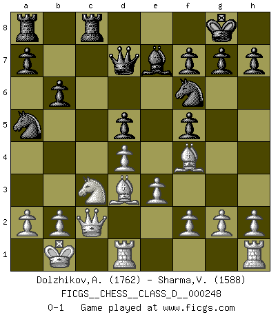 Last move : 0-1 2018 December 13 13:33:23 [Event "FICGS__CHESS__CLASS_D__000248"] [Site "FICGS"] [Date "2018.09.09"] [Round "1"] [White "Dolzhikov,Aleksandr"] [Black "Sharma,Vivek"] [Result "0-1"] [WhiteElo "1762"] [BlackElo "1588"] 1.d4 d5 2.c4 c6 3.Nf3 Nf6 4.Nc3 Bf5 5.Bf4 e6 6.cxd5 cxd5 7.e3 Be7 8.Qb3 b6 9.Nh4 O-O 10.Nxf5 exf5 11.Bd3 Qd7 12.O-O-O Nc6 13.Kb1 Na5 14.Qc2 Rfc8 0-1 QGD Slav : 4.Nc3 Kingside Castling by player Black (move 9) Queenside Castling by player White (move 12) Player Black won this chess game. Follow this game move after move (download)It is not enough to be a good player... you must also play well. (Siegbert Tarrasch) Sehr viele beherrschen heutzutage das große Einmalseins des Schachspiels und kennen sogar dessen Logarithmentafeln auswendig - deshalb sollte man hin und wieder zu beweisen trachten, dass zwei mal zwei auch fünf sein kann. (Mikhail Nekhemyevich Tal) El sobresalir en el Ajedrez es un signo de una mente intrigante. (Sir Arthur Conan Doyle) Ce qui est bien, c'est d'avoir tout un tas de pièces en prise : l'adversaire ne peut en prendre qu'une à la fois. Cité par Thierry Audin. Computers have lots of memory but no imagination. (Anonymous)