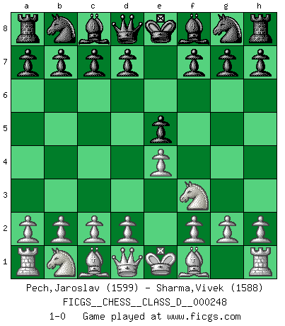 Last move : 1-0 2018 November 14 22:34:32 [Event "FICGS__CHESS__CLASS_D__000248"] [Site "FICGS"] [Date "2018.09.09"] [Round "1"] [White "Pech,Jaroslav"] [Black "Sharma,Vivek"] [Result "1-0"] [WhiteElo "1599"] [BlackElo "1588"] 1.e4 e5 2.Nf3 1-0 This chess game has been lost on time (started : 2018.09.09 12:26:24) King's knight Opening Player White won this chess game. Follow this game move after move (download)The Chess pieces are the block alphabet which shapes thoughts; and these thoughts, although making a visual design on the chessboard, express their beauty abstractly, like a poem. (Marcel Duchamp) Privat ist Kortschnoi kein schlechter Mensch, sehr sympathisch. Aber während des Spiels ist er grausam. Er will dich töten. (Miguel Najdorf) Una compensación adecuada por un sacrificio es tener una combinación sólida que conduce a una posición ganadora; una compensación adecuada por una metida de pata es dejar a tu oponente arrebatar una derrota de las fauces de la victoria. (Bruce A. Moon) J'ai toujours senti une vague pitié pour l'homme qui ne connaît rien aux échecs, tout comme j'en aurais pour un homme ignorant de l'amour. Les Echecs, comme la musique ou comme l'amour, ont le pouvoir de rendre heureux. (Siegbert Tarrasch) It is not enough to be a good player... you must also play well. (Siegbert Tarrasch)