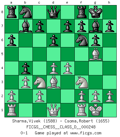 Last move : 0-1 2018 October 27 22:6:4 [Event "FICGS__CHESS__CLASS_D__000248"] [Site "FICGS"] [Date "2018.09.09"] [Round "1"] [White "Sharma,Vivek"] [Black "Csoma,Robert"] [Result "0-1"] [WhiteElo "1588"] [BlackElo "1655"] 1.e4 d6 2.d4 Nf6 3.Nc3 g6 4.Bc4 Bg7 5.Nf3 O-O 6.O-O a6 7.b3 b5 8.Bd3 Bb7 9.Bg5 b4 0-1 This chess game has been lost on time (started : 2018.09.09 12:26:24) Pirc : Holmov system Kingside Castling by player Black (move 5) Kingside Castling by player White (move 6) Player Black won this chess game. Follow this game move after move (download)If cunning alone were needed to excel, women would be the best Chess players. (Albin) Das Schachspiel ist ein See, in welchem eine Mücke baden und ein Elefant ertrinken kann. (Emanuel Lasker) Evita las multitudes. Haz independientemente tu propio razonamiento. Trata de ser el jugador de Ajedrez, no la pieza de Ajedrez. (Ralph Charell) Pour moi, les échecs ne sont pas un jeu mais un art. (Alexandre Alekhine) The problem with manipulation is that people can turn on you. (Horatio Caine, C.S.I. Miami)
