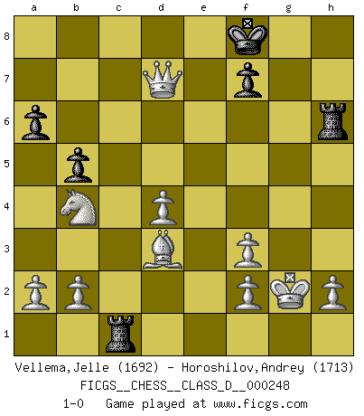 Last move : 1-0 2018 November 7 20:42:29 [Event "FICGS__CHESS__CLASS_D__000248"] [Site "FICGS"] [Date "2018.09.09"] [Round "1"] [White "Vellema,Jelle"] [Black "Horoshilov,Andrey"] [Result "1-0"] [WhiteElo "1692"] [BlackElo "1713"] 1.d4 d5 2.Nf3 Nf6 3.e3 Bg4 4.c4 e6 5.Be2 c6 6.O-O Be7 7.Nc3 Nbd7 8.cxd5 cxd5 9.Bb5 a6 10.Be2 O-O 11.Bd3 h6 12.Qc2 Bxf3 13.gxf3 e5 14.Kh1 exd4 15.exd4 b5 16.Rg1 Bb4 17.Bxh6 Nh5 18.Rxg7+ Nxg7 19.Rg1 Qf6 20.Rxg7+ Qxg7 21.Bxg7 Kxg7 22.Nxd5 Rac8 23.Qd1 Rh8 24.Nxb4 Rh5 25.Qg1+ Kf8 26.Qg4 Rc1+ 27.Kg2 Rh6 28.Qxd7 1-0 Queen's pawn game Kingside Castling by player White (move 6) Kingside Castling by player Black (move 10) Player White won this chess game. Follow this game move after move (download)There's never before been a Chess player with such a thorough knowledge of the intricacies of the game and such an absolutely indomitable will to win. I think Bobby is the greatest player that ever lived. (Lisa Lane) Besser ein falscher Plan, logisch durchgeführt, als gar kein Plan. (Viktor Kortschnoi) Tu no necesitas jugar muy bien, únicamente ayudar a tu oponenet a que juegue muy mal. (Genrikh Chepukaitis) Il (Jacob Murray) ne joue pas pour le bon coup, mais pour le meilleur. (Eloi Relange) Men never do evil so completely and cheerfully as when they do it from religious conviction. (Blaise Pascal)