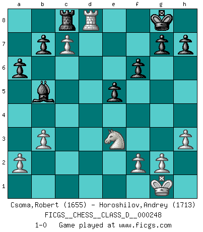 Last move : 1-0 2018 November 14 1:15:21 [Event "FICGS__CHESS__CLASS_D__000248"] [Site "FICGS"] [Date "2018.09.09"] [Round "1"] [White "Csoma,Robert"] [Black "Horoshilov,Andrey"] [Result "1-0"] [WhiteElo "1655"] [BlackElo "1713"] 1.Nf3 Nf6 2.d4 d5 3.c4 dxc4 4.Qa4+ c6 5.Qxc4 Qd5 6.Qxd5 Nxd5 7.e4 Nb6 8.Bd3 e6 9.O-O Be7 10.Nc3 O-O 11.Be3 N8d7 12.Rac1 f6 13.h3 e5 14.d5 cxd5 15.exd5 a6 16.Nd2 Bb4 17.Bxb6 Nxb6 18.Bc4 Nxc4 19.Nxc4 Bf5 20.Ne3 Bd3 21.Rfd1 Bxc3 22.Rxc3 Bb5 23.Rc7 Rab8 24.b3 Rf7 25.d6 Rxc7 26.dxc7 Rc8 27.Rd8+ 1-0 Reti Opening Kingside Castling by player White (move 9) Kingside Castling by player Black (move 10) Player White won this chess game. Follow this game move after move (download)No price is too great for the scalp of the enemy King. (Koblentz) Fallen sollten polizeilich verboten werden. (Savielly Grigorievitsch Tartakower) Las Aperturas te enseñan aperturas. ¡Los Finales te enseñan Ajedrez!. (Stephan Gerzadowicz) Le jeu d'échecs fait naître et fortifie en nous plusieurs qualités précieuses dans le cours de l'existence, telles que la prévoyance, la circonspection, la prudence, et la persévérance. (Benjamin Franklin - 1783, la morale des échecs) Life is the sum of all your choices. (Albert Camus)