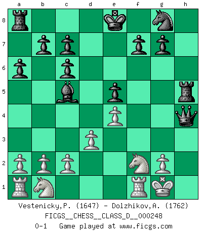Last move : 0-1 2018 September 21 11:39:11 [Event "FICGS__CHESS__CLASS_D__000248"] [Site "FICGS"] [Date "2018.09.09"] [Round "1"] [White "Vestenicky,Patrik"] [Black "Dolzhikov,Aleksandr"] [Result "0-1"] [WhiteElo "1647"] [BlackElo "1762"] 1.e4 e5 2.Nf3 Nc6 3.Bb5 a6 4.Bxc6 dxc6 5.O-O Bg4 6.h3 h5 7.d3 Bc5 8.hxg4 hxg4 9.Ng5 g3 10.Nh3 gxf2+ 11.Nxf2 Qh4 12.Bh6 Rxh6 13.Qh5 Rxh5 0-1 Ruy Lopez : Exchange variation, Alapin gambit Kingside Castling by player White (move 5) Player Black won this chess game. Follow this game move after move (download)There just isn't enough televised Chess. (David Letterman) Eine Person mit durchschnittlichem IQ kann etwa eine ELO von 2000 erreichen. (Jonathan Levitt) Siempre es mejor sacrificar los hombres de tu oponente. (Savielly Tartakower) Il n'y a pas eu de défaite parce que je ne crois pas que cet ordinateur ait jamais existé. IBM a triché en refusant d'imprimer les modes de recherche de la machine. C'est évident, pendant le match, des coups décisifs ont été joués par des êtres humains. Aujourd'hui, les meilleurs spécialistes en informatique ne peuvent toujours pas expliquer comment Deep-Blue a pu jouer contre la logique des ordinateurs. IBM a gagné une guerre de communication, mais ils sont incapables de prouver que l'ordinateur a gagné tout seul. (Garry Kasparov) At work, the authority of a person is inversely proportional to the number of pens that person is carrying. (Dan Rotaru)