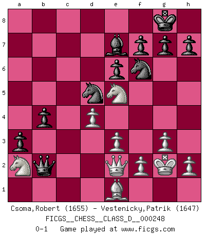 Last move : 0-1 2018 September 15 17:51:39 [Event "FICGS__CHESS__CLASS_D__000248"] [Site "FICGS"] [Date "2018.09.09"] [Round "1"] [White "Csoma,Robert"] [Black "Vestenicky,Patrik"] [Result "0-1"] [WhiteElo "1655"] [BlackElo "1647"] 1.Nf3 Nf6 2.d4 d5 3.c4 c6 4.Nc3 dxc4 5.a4 Bf5 6.e3 Nbd7 7.Bxc4 e6 8.O-O Bb4 9.Qb3 a5 10.Na2 Be7 11.Bd3 Qb6 12.Qc2 Bxd3 13.Qxd3 Qa6 14.Qc2 b5 15.axb5 cxb5 16.Bd2 Qb7 17.Nc1 a4 18.Na2 b4 19.b3 a3 20.Rac1 O-O 21.Qd1 Rfc8 22.Qe2 Rab8 23.Rxc8+ Rxc8 24.Rc1 Rxc1+ 25.Nxc1 Qe4 26.Be1 Qb1 27.Na2 Nd5 28.g3 N7f6 29.Kg2 Qxb3 30.Ne5 Qb2 0-1 Reti Opening Kingside Castling by player White (move 8) Kingside Castling by player Black (move 20) Player Black won this chess game. Follow this game move after move (download)In blitz, the Knight is stronger than the Bishop. (Vlastimil Hort) Korrekt heißt in Deutschland die Haltung eines Mannes, dessen Benehmen nach dem Urteile seiner Nachbarn seiner Stellung angemessen ist. Um korrekt zu sein, muß man sich der Meinung der anderen anpassen... (Emanuel Lasker) Cuando no sepas que mover, espera por una idea que se le venga a la la cabeza de tu oponente. Tenlo por seguro de que esa idea estará incorrecta. (Siegbert Tarrasch) L'ordinateur a tué l'originalité. Il n'y a plus guère d'aventures sur l'échiquier. (Jacob Murray) If you know the enemy and know yourself you need not fear the results of a hundred battles. (Sun Tzu)