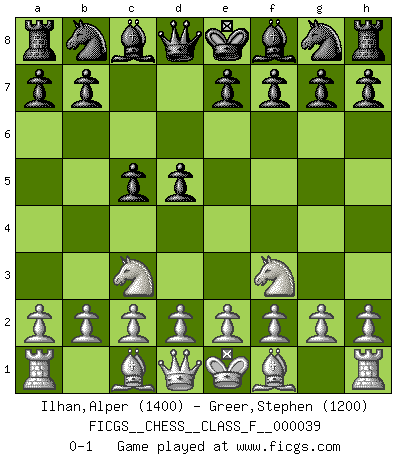 Last move : 0-1 2007 June 29 21:13:53 [Event "FICGS__CHESS__CLASS_F__000039"] [Site "FICGS"] [Date "2007.05.18"] [Round "1"] [White "Ilhan,Alper"] [Black "Greer,Stephen"] [Result "0-1"] [WhiteElo "1400"] [BlackElo "1200"] 1.Nf3 d5 2.Nc3 c5 0-1 This chess game has been lost on time (started : 2007.05.18 8:47:38) Reti Opening Player Black won this chess game. Follow this game move after move (download)As one by one I mowed them down, my superiority soon became apparent. (Jose Capablanca) Frage des Reporters: -Worin besteht das Ziel von Gambiteröffnungen? Antwort: -Auf Kosten der Partie einen Ruf als Angriffspieler zu erwerben.- (Siegbert Tarrasch) Cuando tengo las piezas blancas, yo gano porque soy blanco; Cuando tengo las piezas negras, yo gano porque soy Bogolyubov. (Bogolyubov) Le succès, c'est être capable d'aller d'échec en échec sans perdre son enthousiasme. (Winston Churchill) Wisdom begins at the end. (Daniel Webster)