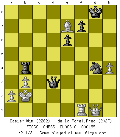 Last move : 1/2-1/2 2019 April 19 8:58:50 [Event "FICGS__CHESS__CLASS_A__000195"] [Site "FICGS"] [Date "2018.09.09"] [Round "1"] [White "Casier,Wim"] [Black "de la Foret,Fred"] [Result "1/2-1/2"] [WhiteElo "2262"] [BlackElo "2027"] 1.e4 c5 2.Nf3 d6 3.d4 cxd4 4.Nxd4 Nf6 5.Nc3 a6 6.h3 e6 7.g4 Be7 8.Bg2 h6 9.Be3 Nc6 10.Nxc6 bxc6 11.Qd2 d5 12.O-O-O Rb8 13.Kb1 O-O 14.b3 a5 15.g5 hxg5 16.Bxg5 a4 17.Rhg1 axb3 18.cxb3 Re8 19.Bf3 Ba6 20.Bh6 g6 21.Qc2 d4 22.Be2 Kh7 23.Be3 Qc7 24.Rxd4 c5 25.Ra4 Bxe2 26.Qxe2 Rb4 27.f3 Qe5 28.Rc1 Rd8 29.Ra7 Nd7 30.Qd2 Nb8 31.Qe1 Rd7 32.f4 Qh8 33.Rxd7 Nxd7 34.h4 Nf6 35.f5 gxf5 36.Bg5 fxe4 37.Qf2 Qg7 38.Rf1 e3 39.Bxe3 Kg8 40.Bxc5 Ng4 41.Qg1 Qxc3 42.Bxe7 Qd3+ 43.Kb2 1/2-1/2 Sicilian : Najdorf, Adams attack Queenside Castling by player White (move 12) Kingside Castling by player Black (move 13) This chess game ended in a draw. Follow this game move after move (download)Fischer is completely natural. He plays no roles. He's like a child. Very, very simple. (Zita Rajcsanyi) Ich liebe den Moment, wenn ich das Ego meines Gegenüber breche. (Robert James Fischer) Yo no le temo a Spassky. Todos saben que yo soy el mejor. Uno no necesita un torneo para probarlo. (Bobby Fischer) Les échecs, c'est l'imagination. (David Bronstein) There are lots of people who mistake their imagination for their memory. (Josh Bilings)