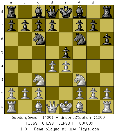 Last move : 1-0 2007 June 29 15:13:22 [Event "FICGS__CHESS__CLASS_F__000039"] [Site "FICGS"] [Date "2007.05.18"] [Round "1"] [White "Sweden,Swed"] [Black "Greer,Stephen"] [Result "1-0"] [WhiteElo "1400"] [BlackElo "1200"] 1.e4 e5 2.Nc3 Nf6 3.d3 h6 4.Nf3 Nc6 5.d4 1-0 This chess game has been lost on time (started : 2007.05.18 8:47:38) Vienna : Falkbeer variation Player White won this chess game. Follow this game move after move (download)Play the opening like a book, the middle game like a magician, and the endgame like a machine. (Spielmann) Charakterschwächen offenbaren sich normalerweise während einer Schachpartie. (Garry Kasparov) Me siento como si fuera una pieza en una partida de Ajedrez, cuando mi oponente me indica: esa pieza no puede ser movida. (Soren Kierkegaard) Shah mat. Le roi est mort. Cri de fierté d'un joueur venant de terrasser son adversaire, courtoisement, sans effusion de sang. May the force be with you. (Han Solo in Star Wars ep.4)