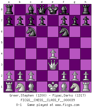 Last move : 0-1 2007 June 30 3:20:6 [Event "FICGS__CHESS__CLASS_F__000039"] [Site "FICGS"] [Date "2007.05.18"] [Round "1"] [White "Greer,Stephen"] [Black "Pipac,Darko"] [Result "0-1"] [WhiteElo "1200"] [BlackElo "1317"] 1.e4 e5 2.d4 exd4 3.Qxd4 Nc6 4.Qe3 Nf6 0-1 This chess game has been lost on time (started : 2007.05.18 8:47:38) Centre game : Berger variation Player Black won this chess game. Follow this game move after move (download)War is the child of passion, passion is the child of narcissism and narcissism is the child. (...) Another game ? (Thibault de Vassal) Man kann eine Schachpartie nur gewinnen, wenn das Gleichgewicht gestört ist. In einer Stellung mit ungestörtem Gleichgewicht ist auch das größte Genie hilflos - in der Stellung steckt dann eben kein genialer Einfall. (Wilhelm Steinitz) Nunca antes ha habido un jugador de Ajedrez con tal conocimiento a fondo de las complejidades del juego y una inmensa voluntad absolutamente indomable de ganar. Yo pienso que Fischer es el jugador mas grande que jamás haya existido. (Lisa Lane) Tous ces prétendus hommes politiques sont les pions, les Cavaliers, les Tours ou les Fous d'une partie d'échecs qui se jouera tant qu'un hasard ne renversera pas l'échiquier. (Honoré de Balzac) Men never do evil so completely and cheerfully as when they do it from religious conviction. (Blaise Pascal)