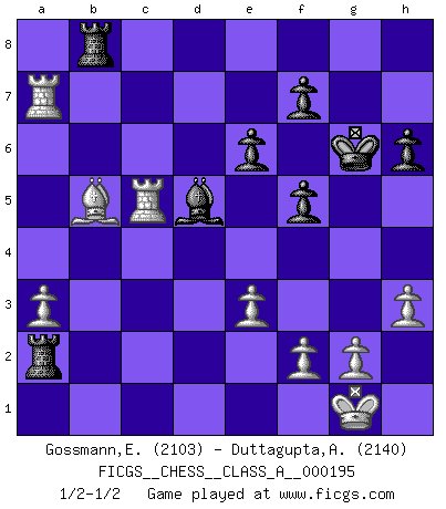Last move : 1/2-1/2 2019 February 21 21:32:42 [Event "FICGS__CHESS__CLASS_A__000195"] [Site "FICGS"] [Date "2018.09.09"] [Round "1"] [White "Gossmann,Ewald"] [Black "Duttagupta,Aniruddha"] [Result "1/2-1/2"] [WhiteElo "2103"] [BlackElo "2140"] 1.d4 d5 2.c4 c6 3.Nf3 Nf6 4.Nc3 e6 5.Bg5 h6 6.Bxf6 Qxf6 7.e3 Nd7 8.Bd3 dxc4 9.Bxc4 Bd6 10.Rc1 O-O 11.O-O Qe7 12.Ne4 b6 13.Qe2 a5 14.Rfd1 Bb7 15.Nxd6 Qxd6 16.Bd3 Rfd8 17.Nd2 c5 18.Ne4 Qe7 19.dxc5 Nxc5 20.Nxc5 bxc5 21.Qc2 Qh4 22.Bf1 Bd5 23.a3 Rab8 24.Rd2 Rd6 25.Qc3 Rdb6 26.h3 a4 27.R1c2 Qf6 28.Qxf6 gxf6 29.Rxc5 Rxb2 30.Rd4 Ra2 31.Bb5 f5 32.Rxa4 Kh7 33.Ra7 Kg6 1/2-1/2 QGD Slav : 4.Nc3 Kingside Castling by player Black (move 10) Kingside Castling by player White (move 11) This chess game ended in a draw. Follow this game move after move (download)The beauty of a move lies not in its' appearance but in the thought behind it. (Siegbert Tarrasch) Wenn ich mich einlogge, glauben die Leute gewöhnlich nicht, dass ich es selbst bin und sie fangen an, mir dumme Fragen zu stellen. Und wenn sie es glauben, stellen sie wieder andere dumme Fragen. (Judith Polgar) Si no le temes a Spassky, entonces elimino el elemento del dinero. (Jim Slater) Seul un grand joueur sait à quel point il joue faiblement. (Xavier Tartacover) Men never do evil so completely and cheerfully as when they do it from religious conviction. (Blaise Pascal)