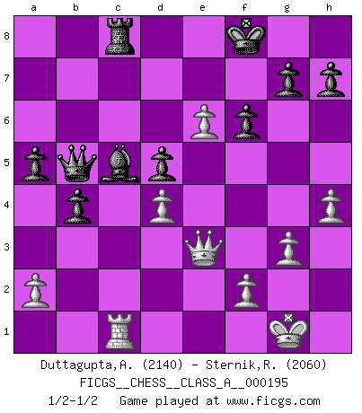 Last move : 1/2-1/2 2019 March 2 10:11:7 [Event "FICGS__CHESS__CLASS_A__000195"] [Site "FICGS"] [Date "2018.09.09"] [Round "1"] [White "Duttagupta,Aniruddha"] [Black "Sternik,Ryszard"] [Result "1/2-1/2"] [WhiteElo "2140"] [BlackElo "2060"] 1.d4 Nf6 2.c4 e6 3.g3 d5 4.Nf3 dxc4 5.Bg2 c5 6.O-O Nc6 7.Qa4 Bd7 8.Qxc4 b5 9.Qd3 c4 10.Qc2 Rc8 11.e4 Be7 12.Qe2 O-O 13.Rd1 Na5 14.Ne5 b4 15.Nxd7 Qxd7 16.Be3 Rfd8 17.Rc1 Qa4 18.Nd2 c3 19.Nb3 cxb2 20.Qxb2 Nc4 21.Qe2 Nxe3 22.Qxe3 Qa6 23.Rxc8 Rxc8 24.e5 Nd5 25.Bxd5 exd5 26.Nc5 Qc4 27.e6 f6 28.Qd2 Bxc5 29.Rc1 Qb5 30.Qe3 a5 31.h4 Kf8 1/2-1/2 Catalan Opening Kingside Castling by player White (move 6) Kingside Castling by player Black (move 12) This chess game ended in a draw. Follow this game move after move (download)The tactician knows what to do when there is something to do; whereas the strategian knows what to do when there is nothing to do. (Gerald Abrahams) Mit sehr nachdenklichem Gesicht schreitet Bobby durch den Turniersaal. Was ist passiert?, fragt Lombardy. Ich stehe schlecht, antwortet Fischer. Lombardy: Dann biete doch einfach Remis an. Fischer: So schlecht stehe ich nun auch wieder nicht! (Robert James Fischer) La táctica fluye a partir de una posición superior. (Bobby Fischer) Les Echecs ont trois composantes : le temps, l'espace et le matériel en dernier. (Mikhail Tal) Perfection is achieved, not when there is nothing more to add, but when there is nothing left to take away. (Antoine de Saint-Exupéry)