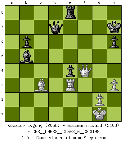 Last move : 1-0 2018 December 20 13:30:49 [Event "FICGS__CHESS__CLASS_A__000195"] [Site "FICGS"] [Date "2018.09.09"] [Round "1"] [White "Kopasov,Evgeny"] [Black "Gossmann,Ewald"] [Result "1-0"] [WhiteElo "2066"] [BlackElo "2103"] 1.d4 Nf6 2.c4 e6 3.Nc3 Bb4 4.Qc2 O-O 5.Nf3 d5 6.cxd5 exd5 7.Bg5 h6 8.Bh4 Be6 9.e3 Nbd7 10.Bd3 c5 11.dxc5 Rc8 12.O-O Nxc5 13.Nb5 Nce4 14.Qb3 Be7 15.Nbd4 Nc5 16.Qd1 Qb6 17.b3 Nxd3 18.Qxd3 g5 19.Bg3 Bc5 20.Be5 Ne4 21.Nd2 Nxd2 22.Qxd2 Bg4 23.h3 Bh5 24.Nc2 Bg6 25.Rac1 Rfd8 26.Ba1 Qe6 27.Nd4 Qe7 28.Nb5 Kh7 29.a3 Be4 30.b4 Bb6 31.Qb2 f5 32.a4 Rc4 33.Rxc4 dxc4 34.a5 Bc7 35.f3 Bd3 36.Nxc7 Qxc7 37.Qf6 Qd7 38.Re1 Re8 39.e4 fxe4 40.Re3 b5 41.axb6 axb6 42.b5 c3 43.Bxc3 Bxb5 44.f4 gxf4 45.Qxf4 1-0 Nimzo-Indian : Classical variation Kingside Castling by player Black (move 4) Kingside Castling by player White (move 12) Player White won this chess game. Follow this game move after move (download)Chess is the gymnasium of the mind. (Blaise Pascal) Dass jemand wie Surab Asmaiparaschwili, der selbst Elopunkte gekauft hat , Vize-Präsident der Fide werden konnte, sagt schon einges über den Zustand dieser Organisation aus. (Joel Lautier) Una de estas pequeñas movidas modestas pudieran ser mas molestas a tu oponente que la amenaza mas grande. (Siegbert Tarrasch) L'ordinateur a tué l'originalité. Il n'y a plus guère d'aventures sur l'échiquier. (Jacob Murray) The good fighters of old first put themselves beyond the possibility of defeat, and then waited for an opportunity of defeating the enemy. (Sun Tzu)