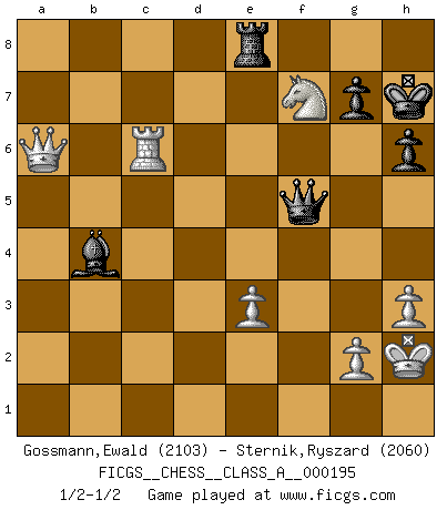 Last move : 1/2-1/2 2018 October 12 20:2:35 [Event "FICGS__CHESS__CLASS_A__000195"] [Site "FICGS"] [Date "2018.09.09"] [Round "1"] [White "Gossmann,Ewald"] [Black "Sternik,Ryszard"] [Result "1/2-1/2"] [WhiteElo "2103"] [BlackElo "2060"] 1.e4 c5 2.Nf3 d6 3.d4 cxd4 4.Nxd4 Nf6 5.Nc3 a6 6.Bg5 e6 7.Qf3 Nbd7 8.Be2 Qc7 9.a4 b6 10.O-O Bb7 11.Rad1 Be7 12.Qg3 Nc5 13.Bf3 O-O 14.Rfe1 Kh8 15.e5 dxe5 16.Bxb7 Qxb7 17.Qxe5 Rfd8 18.Qe2 h6 19.Be3 Rac8 20.h3 Nd5 21.Nxd5 Rxd5 22.Nf3 Nxa4 23.Rxd5 Qxd5 24.Rd1 Qc6 25.Ne5 Qxc2 26.Qg4 Nc5 27.Nxf7+ Kh7 28.b4 Ne4 29.Ra1 Nf6 30.Qxe6 Bxb4 31.Rc1 Re8 32.Qxb6 Qb2 33.Rc6 Nd5 34.Qxa6 Qb1+ 35.Kh2 Nxe3 36.fxe3 Qf5 1/2-1/2 Sicilian : Najdorf, 6...e6 Kingside Castling by player White (move 10) Kingside Castling by player Black (move 13) This chess game ended in a draw. Follow this game move after move (download)Some part of a mistake is always correct. (Savielly Tartakover) Schach sollte überall auf der Welt Schulfach werden. Es fördert die geistige Auseinandersetzung. Es lehrt die Demut in der Niederlage. (Garry Kasparov) Con el fin de mejorar tu juego, debes de estudiar los finales antes que todo, ya que mientras que los finales pueden ser estudiados y dominados por sí mismos, el juegomedio y la apertura deben de ser estudiados en relación con los finales. (José Raúl Capablanca) 'L'échange des dames est un coup dur pour les deux adversaires...' Un journaliste lors d'une partie du match Spassky-Fischer Now you put water in a cup, it becomes the cup; You put water into a bottle it becomes the bottle; You put it in a teapot it becomes the teapot. Water can flow or it can crash. Be water, my friend. (Bruce Lee)