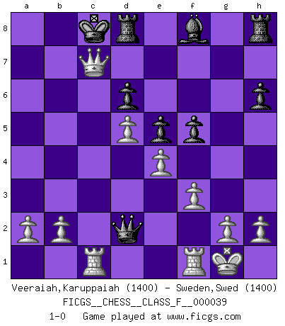 Last move : 1-0 2007 June 27 18:39:8 [Event "FICGS__CHESS__CLASS_F__000039"] [Site "FICGS"] [Date "2007.05.18"] [Round "1"] [White "Veeraiah,Karuppaiah"] [Black "Sweden,Swed"] [Result "1-0"] [WhiteElo "1400"] [BlackElo "1400"] 1.e4 e5 2.Nf3 d6 3.Nc3 Nf6 4.Bc4 Be6 5.Bxe6 fxe6 6.d4 exd4 7.Nxd4 e5 8.Bg5 h6 9.Bxf6 Qxf6 10.Nf5 Nc6 11.Nd5 Qg5 12.O-O O-O-O 13.c4 Ne7 14.Qa4 Nxd5 15.cxd5 Qg4 16.f3 Qf4 17.Qxa7 Qd2 18.Qa8+ Kd7 19.Qxb7 g6 20.Qc6+ Kc8 21.Rac1 gxf5 22.Qxc7+ 1-0 Philidor's defense Kingside Castling by player White (move 12) Queenside Castling by player Black (move 12) Player White won this chess game. Follow this game move after move (download)Chess is no whit inferior to the violin, and we have a large number of professional violinists. (Mikhail Botvinnik) Im Reiche der Wirklichkeit ist man nie so glücklich wie im Reiche der Gedanken. (Arthur Schopenhauer) Hoy en día, si tu no eres un Gran Maestro a los 14 años, es mejor que lo olvides. (Anand Viswanathan) La conception d'un plan est le processus par lequel un joueur exploite les avantages de sa position tout en s'efforçant d'en réduire au minimum les inconvénients. Afin de garantir le succès, un plan doit toujours se fonder sur un diagnostic objectif des particularités d'une position. La conception d'un plan est d'autant plus difficile que la position est équilibrée, et grandement facilitée lorsqu'il n'existe qu'un seul plan susceptible de répondre aux exigences de la position. (Harry Golombek) Humor is by far the most significant activity of the human brain. (Edward De Bono)