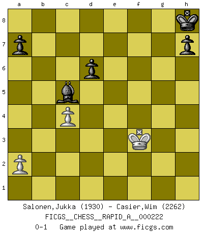 Last move : 0-1 2019 January 16 7:27:53 [Event "FICGS__CHESS__RAPID_A__000222"] [Site "FICGS"] [Date "2018.09.09"] [Round "1"] [White "Salonen,Jukka"] [Black "Casier,Wim"] [Result "0-1"] [WhiteElo "1930"] [BlackElo "2262"] 1.d4 Nf6 2.c4 g6 3.Nc3 Bg7 4.e4 d6 5.Be2 O-O 6.Nf3 e5 7.O-O Nc6 8.d5 Ne7 9.Be3 Ng4 10.Bd2 f5 11.Ng5 Nf6 12.exf5 gxf5 13.Qb3 f4 14.Bd3 Nf5 15.Qd1 Kh8 16.Nf3 c5 17.dxc6 bxc6 18.Re1 Ng4 19.Na4 Nh4 20.h3 Nh6 21.Nxh4 Qxh4 22.Be4 Rf6 23.Qb3 Be6 24.Bxc6 Raf8 25.Bf3 Rg6 26.Kf1 Rxg2 27.Bxg2 f3 28.Kg1 Ng4 29.Re2 e4 30.Nc3 e3 31.Ne4 exf2+ 32.Nxf2 fxe2 33.Nxg4 Bxg4 34.Qe3 Bxh3 35.Qxh3 Qd4+ 36.Qe3 Qxb2 37.Qxe2 Qxa1+ 38.Qe1 Qd4+ 39.Be3 Qg4 40.Bf2 Be5 41.Qd2 Qh5 42.Qd3 Qh2+ 43.Kf1 Qf4 44.Bf3 Qxf3 45.Qxf3 Rxf3 46.Ke2 Rxf2+ 47.Kxf2 Bd4+ 48.Kf3 Bc5 0-1 King's Indian : 5.Be2 Kingside Castling by player Black (move 5) Kingside Castling by player White (move 7) 10 pieces endgame at move 45 : White KBPP , Black KRBPPP WHITE : King + 1 Bishop 2 Pawns BLACK : King + 1 Rook 1 Bishop 3 Pawns 9 pieces endgame at move 46 : White KPP , Black KRBPPP WHITE : King + 2 Pawns BLACK : King + 1 Rook 1 Bishop 3 Pawns 8 pieces endgame at move 47 : White KPP , Black KBPPP WHITE : King + 2 Pawns BLACK : King + 1 Bishop 3 Pawns Player Black won this chess game. Follow this game move after move (download)It is always better to sacrifice your opponent's men. (Savielly Tartakower) Ich moechte nie einem Club beitreten, der Leute wie mich als Mitglieder aufnimmt. (Woody Allen) Cuando veas una buena jugada, trata de encontrar otra mejor. (Emanuel Lasker) Vous savez, camarade Pachman, je n'éprouve pas de plaisir à être ministre, je jouerais plutôt aux échecs comme vous, ou alors ferais une révolution au Venezuela. (Che Guevara à Ludek Pachman, 'Checkmate in Prague', 1975) I teach you to lie, cheat and steal, and as soon as my back's turned you wait in line ? (Gregory House, House M.D.)