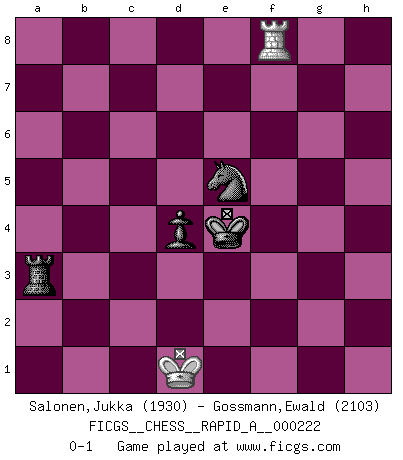 Last move : 0-1 2018 December 31 8:40:41 [Event "FICGS__CHESS__RAPID_A__000222"] [Site "FICGS"] [Date "2018.09.09"] [Round "1"] [White "Salonen,Jukka"] [Black "Gossmann,Ewald"] [Result "0-1"] [WhiteElo "1930"] [BlackElo "2103"] 1.e4 e6 2.d4 d5 3.e5 c5 4.c3 Nc6 5.Nf3 Bd7 6.Be2 Nge7 7.Na3 cxd4 8.Nb5 Ng6 9.cxd4 a6 10.Nc3 f6 11.exf6 Qxf6 12.Bg5 Qf7 13.O-O Bd6 14.g3 O-O 15.Be3 h6 16.Na4 Be8 17.Rc1 Nge7 18.Nc5 Nf5 19.Qb3 Rb8 20.Bd3 g5 21.a3 Qh5 22.Qd1 Qh3 23.Be2 Bg6 24.Rc3 Bxc5 25.dxc5 Rbd8 26.Bxg5 d4 27.Rb3 d3 28.Rxd3 Rxd3 29.Bxd3 Bh5 30.Bxh6 Nxh6 31.Ng5 Bxd1 32.Nxh3 Bb3 33.Rc1 Nf7 34.Rc3 Bd5 35.Nf4 Nfe5 36.Bc2 Nf3+ 37.Kg2 Ne1+ 38.Kf1 Nxc2 39.Rxc2 Rd8 40.Nxd5 exd5 41.f4 a5 42.b3 Kf7 43.Kf2 Ke6 44.Ke3 Kf5 45.Rd2 Kg4 46.Rb2 Re8+ 47.Kf2 d4 48.Re2 Rh8 49.Kg2 Rh5 50.Rc2 Ne7 51.Kf1 Nf5 52.Rf2 Ne3+ 53.Ke2 Rxc5 54.Kd3 Nf5 55.Rc2 Rb5 56.b4 axb4 57.axb4 Rxb4 58.Rc5 Ne3 59.f5 Kg5 60.Ke4 Kf6 61.Rc8 Nxf5 62.Rf8+ Ke6 63.Re8+ Kd7 64.Rg8 Ne7 65.Rg5 Nc6 66.h4 Rb1 67.Rg7+ Kd6 68.h5 Re1+ 69.Kd3 Rh1 70.Rxb7 Rxh5 71.Rg7 Re5 72.Kd2 Re3 73.Rg8 Kd5 74.Kc2 Ne5 75.Rf8 Rc3+ 76.Kd1 Rxg3 77.Kc2 Ra3 78.Kd1 Ke4 0-1 French : Advance, Euwe variation Kingside Castling by player White (move 13) Kingside Castling by player Black (move 14) 10 pieces endgame at move 57 : White KRPPP , Black KRNPP WHITE : King + 1 Rook 3 Pawns BLACK : King + 1 Rook 1 Knight 2 Pawns 9 pieces endgame at move 61 : White KRPP , Black KRNPP WHITE : King + 1 Rook 2 Pawns BLACK : King + 1 Rook 1 Knight 2 Pawns 8 pieces endgame at move 70 : White KRPP , Black KRNP WHITE : King + 1 Rook 2 Pawns BLACK : King + 1 Rook 1 Knight 1 Pawn 7 pieces endgame at move 70 : White KRP , Black KRNP WHITE : King + 1 Rook 1 Pawn BLACK : King + 1 Rook 1 Knight 1 Pawn 6 pieces endgame at move 76 : White KR , Black KRNP WHITE : King + 1 Rook BLACK : King + 1 Rook 1 Knight 1 Pawn Player Black won this chess game. Follow this game move after move (download)The battle for the ultimate truth will never be won. And that's why Chess is so fascinating. (Hans Kmoch) Es ist peinlich, dass ich nie Weltmeister wurde. Es wäre leicht, Leonid Breschnjew als Ursache vorzuschieben, dessen Apparat den Vorzeigekommunisten Anatoli Karpow in allem unterstützte. Aber Garri Kasparow zum Beispiel, der ebenfalls von den Sowjets unerwünscht war, hat trotz der Widerstände den WM-Titel erobert. (Viktor Kortschnoi) En el tablero, la mentira e hipocresía no sobreviven mucho. (Emanuel Lasker) Shah mat. Le roi est mort. Cri de fierté d'un joueur venant de terrasser son adversaire, courtoisement, sans effusion de sang. A good book on your shelf is a friend that turns its back on you and remains a friend. (Author unknown)