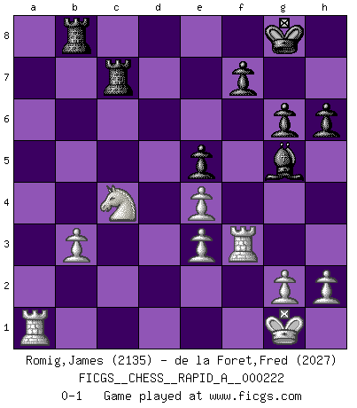 Last move : 0-1 2019 January 12 4:49:38 [Event "FICGS__CHESS__RAPID_A__000222"] [Site "FICGS"] [Date "2018.09.09"] [Round "1"] [White "Romig,James"] [Black "de la Foret,Fred"] [Result "0-1"] [WhiteElo "2135"] [BlackElo "2027"] 1.e4 c5 2.Nf3 d6 3.d4 cxd4 4.Nxd4 Nf6 5.Nc3 a6 6.Be3 e5 7.Nb3 Ng4 8.Be2 Nxe3 9.fxe3 Nd7 10.Bg4 Be7 11.O-O O-O 12.Qd3 h6 13.a4 Bg5 14.Bf5 g6 15.Bh3 Nc5 16.Nxc5 dxc5 17.Rf3 Qxd3 18.cxd3 Bxh3 19.Rxh3 Rfd8 20.Nd5 Rac8 21.b3 b5 22.Rf3 c4 23.axb5 axb5 24.dxc4 bxc4 25.Nb6 Rc7 26.Nxc4 Rb8 0-1 Sicilian : Najdorf, Byrne (English) attack Kingside Castling by player White (move 11) Kingside Castling by player Black (move 11) Player Black won this chess game. Follow this game move after move (download)It is not a move, even the best move that you must seek, but a realizable plan. (Eugene Znosko-Borovsky) Dass jemand wie Surab Asmaiparaschwili, der selbst Elopunkte gekauft hat , Vize-Präsident der Fide werden konnte, sagt schon einges über den Zustand dieser Organisation aus. (Joel Lautier) Uno no tiene que jugar muy bien, es suficiente jugar mejor que el oponente. (Siegbert Tarrasch) L'action d'une oeuvre littéraire se déroule sur un champ de bataille. Les masques et les types du drame moderne correspondent aux pièces du jeu d'échecs. L'intrigue correspond aux coups et aux gambits, c'est à dire aux techniques du jeu telles qu'utilisées et interprétées par les joueurs. Les tactiques et les péripéties [mouvements] correspondent aux coups exécutés par l'adversaire. (Viktor Shklovsky) Whenever people agree with me, I always feel I must be wrong. (Oscar Wilde)