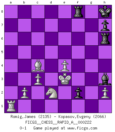 Last move : 0-1 2019 January 13 17:31:46 [Event "FICGS__CHESS__RAPID_A__000222"] [Site "FICGS"] [Date "2018.09.09"] [Round "1"] [White "Romig,James"] [Black "Kopasov,Evgeny"] [Result "0-1"] [WhiteElo "2135"] [BlackElo "2066"] 1.e4 c5 2.Nf3 Nc6 3.d4 cxd4 4.Nxd4 Nf6 5.Nc3 e5 6.Ndb5 d6 7.Bg5 a6 8.Na3 b5 9.Bxf6 gxf6 10.Nd5 f5 11.Bd3 Be6 12.c3 Bg7 13.O-O O-O 14.Nc2 Rc8 15.a4 fxe4 16.Bxe4 f5 17.axb5 axb5 18.Bf3 e4 19.Be2 Kh8 20.Qd2 b4 21.Ndxb4 Nxb4 22.Nxb4 f4 23.Rfe1 Qg5 24.Ba6 Bh3 25.f3 Rg8 26.Re2 Rc5 27.fxe4 f3 28.Qxg5 Rxg5 29.Rd2 Bxg2 30.Kf2 Be5 31.Rd5 Rg4 32.Rxe5 dxe5 33.Bc4 Rf8 34.Nc6 Bh3 35.Nxe5 Rg2+ 36.Ke3 f2 37.Nf3 Rg6 38.Nd2 Rh6 0-1 Sicilian : Pelikan (Lasker/Sveshnikov) variation Kingside Castling by player White (move 13) Kingside Castling by player Black (move 13) Player Black won this chess game. Follow this game move after move (download)For surely of all the drugs in the world, Chess must be the most permanently pleasurable. (Assiac) Ein Schachspiel besteht aus drei Phasen: Die erste, wenn du hofftst den Vorteil zu haben, die zweite, wenn du glaubst einen Vorteil zu haben, und die dritte.... wenn du weißt Du wirst verlieren. (Savielly Grigorievitsch Tartakower) Solo puedes ser bueno en el Ajedrez si amas al juego. (Bobby Fischer) La conception d'un plan est le processus par lequel un joueur exploite les avantages de sa position tout en s'efforçant d'en réduire au minimum les inconvénients. Afin de garantir le succès, un plan doit toujours se fonder sur un diagnostic objectif des particularités d'une position. La conception d'un plan est d'autant plus difficile que la position est équilibrée, et grandement facilitée lorsqu'il n'existe qu'un seul plan susceptible de répondre aux exigences de la position. (Harry Golombek) Don't anthropomorphize computers - they hate it. (Anonymous)