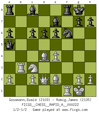 Last move : 1/2-1/2 2018 September 14 18:32:25 [Event "FICGS__CHESS__RAPID_A__000222"] [Site "FICGS"] [Date "2018.09.09"] [Round "1"] [White "Gossmann,Ewald"] [Black "Romig,James"] [Result "1/2-1/2"] [WhiteElo "2103"] [BlackElo "2135"] 1.e4 c5 2.Nf3 d6 3.d4 cxd4 4.Nxd4 Nf6 5.Nc3 a6 6.Bg5 e6 7.f4 Qb6 8.Qd2 Qxb2 9.Rb1 Qa3 10.f5 Nc6 11.fxe6 fxe6 12.Nxc6 bxc6 13.Be2 Be7 14.O-O O-O 15.Rb3 Qc5+ 16.Be3 Qe5 17.Bd4 Qa5 18.Bb6 Qe5 19.Bd4 Qa5 1/2-1/2 Sicilian : Najdorf, 7...Qb6 Kingside Castling by player White (move 14) Kingside Castling by player Black (move 14) This chess game ended in a draw. Follow this game move after move (download)I won't play with you anymore. You have insulted my friend. - When an opponent cursed himself for a blunder. (Miguel Najdorf) Schach ist ein Teil der Kultur, und wenn es mit der Kultur abwärts geht, geht es auch mit dem Schach abwärts. (Mikhail Moiseyevich Botvinik) Si el Ajedrez es una ciencia, es la mas inexacta. Si el Ajedrez es un arte, es demasiado inexacto para ser visto como tal. Si el Ajedrez es un deporte, es demasiado esotérico. Si el Ajedrez es un juego, es demasiado exigente para ser solo un juego. Si el Ajedrez es una aventura, es una muy demandante. Si el Ajedrez es una pasión, es una muy gratificante. Si el Ajedrez es la vida, es una muy triste. (Anónimo) Vous m'avez demandé de vous exposer quel est le fondement de la prière. Je ne fais que préparer les pièces du jeu sur la table... Nous sera-t-il permis d'en adopter les règles et si nous les appliquons scrupuleusement nous ne tarderons pas à faire mat le Roi divin ! Il ne pourra échapper à nos mains. (Sainte Thérèse d'Avila, Chemin de perfection) Depression is just anger without enthusiasm. (Unknown)