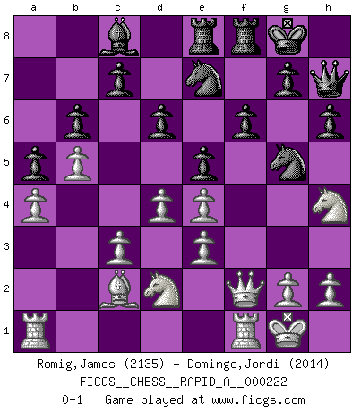 Last move : 0-1 2019 January 15 5:56:38 [Event "FICGS__CHESS__RAPID_A__000222"] [Site "FICGS"] [Date "2018.09.09"] [Round "1"] [White "Romig,James"] [Black "Domingo,Jordi"] [Result "0-1"] [WhiteElo "2135"] [BlackElo "2014"] 1.e4 e5 2.Nf3 Nc6 3.Bb5 Bb4 4.a3 Ba5 5.O-O Nge7 6.d3 O-O 7.Ba4 d6 8.c3 Bb6 9.Bb3 h6 10.Be3 Ng6 11.Nbd2 Qf6 12.a4 Nf4 13.Bc4 Bd7 14.b4 a5 15.b5 Ne7 16.Kh1 Rac8 17.Qe1 Qg6 18.Rg1 Bxe3 19.fxe3 Ne6 20.Rf1 Rce8 21.Kg1 Qh5 22.Qf2 b6 23.d4 f6 24.Be2 Qg6 25.Nh4 Qh7 26.Bd3 Bc8 27.Bc2 Ng5 0-1 Ruy Lopez (Spanish Opening) Kingside Castling by player White (move 5) Kingside Castling by player Black (move 6) Player Black won this chess game. Follow this game move after move (download)Chess is a terrific way for kids to build self image and self esteem. (Saudin Robovic) Mein Name ist Rustam Kamsky. Sie haben meinen Sohn belästigt. Bereiten Sie sich aufs Sterben vor. (Rustam Kamsky) Yo siempre he tenido un ligero sentimiento de lástima por una persona que no tiene conocimiento del Ajedrez. (Siegbert Tarrasch) Aux échecs, les retours au sommet sont rares : les dommages psychologiques consécutifs à une défaite sont trop sévères. (Daily Telegraph) Memory is a way of holding onto the things you love, the things you are, the things you never want to lose. (from the television show: The Wonder Years)