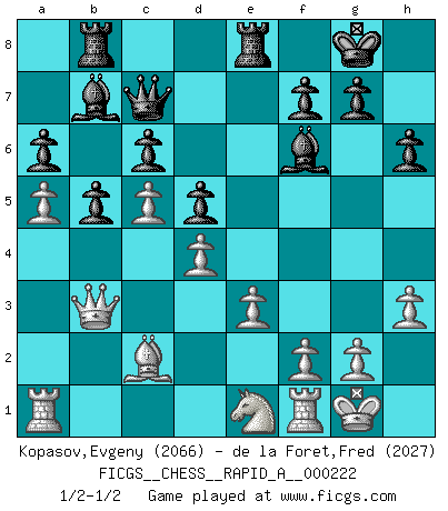 Last move : 1/2-1/2 2018 December 13 20:12:41 [Event "FICGS__CHESS__RAPID_A__000222"] [Site "FICGS"] [Date "2018.09.09"] [Round "1"] [White "Kopasov,Evgeny"] [Black "de la Foret,Fred"] [Result "1/2-1/2"] [WhiteElo "2066"] [BlackElo "2027"] 1.d4 Nf6 2.c4 e6 3.Nc3 d5 4.Bg5 Be7 5.e3 h6 6.Bh4 O-O 7.Nf3 b6 8.Be2 Bb7 9.Bxf6 Bxf6 10.cxd5 exd5 11.b4 Be7 12.Qb3 c6 13.O-O b5 14.a4 a6 15.a5 Nd7 16.Nd1 Nf6 17.Nb2 Ne4 18.Nd3 Rc8 19.h3 Re8 20.Nc5 Nxc5 21.bxc5 Rb8 22.Bd3 Qc7 23.Bc2 Bf6 24.Ne1 1/2-1/2 Queen's pawn game Kingside Castling by player Black (move 6) Kingside Castling by player White (move 13) This chess game ended in a draw. Follow this game move after move (download)With or without the title, Bobby Fischer was unquestionably the greatest player of his time. (Burt Hochberg) Im Schach gewinnt jeder. Hat man Freunde am Spiel - und das ist die Hauptsache - ist auch der Verlust einer Partie kein Unglück. (David Bronstein) Aún deseo matar a Fischer. (Boris Spassky) Karpov est une pièce de musée. (Garry Kasparov) Those who make the worst use of their time are the first to complain of its brevity. (Jean de la Bruyere)
