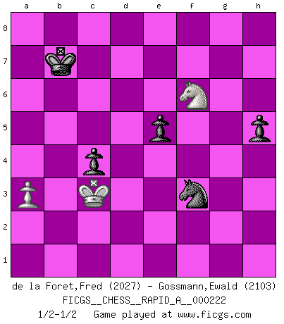 Last move : 1/2-1/2 2018 December 18 22:25:17 [Event "FICGS__CHESS__RAPID_A__000222"] [Site "FICGS"] [Date "2018.09.09"] [Round "1"] [White "de la Foret,Fred"] [Black "Gossmann,Ewald"] [Result "1/2-1/2"] [WhiteElo "2027"] [BlackElo "2103"] 1.e4 c6 2.d4 d5 3.e5 Bf5 4.Nf3 e6 5.Be2 h6 6.O-O Ne7 7.Nbd2 Nd7 8.Re1 Bg6 9.b3 c5 10.Bb2 cxd4 11.Nxd4 Nc6 12.Nxc6 bxc6 13.Bd3 Bxd3 14.cxd3 a5 15.d4 c5 16.Qg4 cxd4 17.Nf3 d3 18.Red1 h5 19.Qd4 Bc5 20.Qxd3 O-O 21.Bd4 a4 22.Bxc5 Nxc5 23.Qd4 Ne4 24.b4 Qe7 25.a3 Rac8 26.Rac1 Rc7 27.Qe3 Rfc8 28.Rxc7 Qxc7 29.Nd4 Qxe5 30.f3 Rc3 31.Qe1 Rc4 32.Qe3 Qg5 33.Qxg5 Nxg5 34.Ne2 Rc2 35.Kf1 Nh7 36.Rb1 Nf6 37.b5 Nd7 38.b6 Kf8 39.b7 Nb8 40.Rb4 Ke7 41.h4 Kd6 42.Rxa4 Kc7 43.Rf4 f6 44.Rb4 e5 45.Rb5 Kc6 46.Rb4 Rc4 47.Rxc4+ dxc4 48.Ng3 g6 49.Ke2 Kxb7 50.Ne4 Nc6 51.Nxf6 Nd4+ 52.Kd2 Nf5 53.Kc3 Nxh4 54.g4 Nxf3 55.gxh5 gxh5 1/2-1/2 Caro-Kann : Advance variation Kingside Castling by player White (move 6) Kingside Castling by player Black (move 20) 10 pieces endgame at move 54 : White KNPP , Black KNPPPP WHITE : King + 1 Knight 2 Pawns BLACK : King + 1 Knight 4 Pawns 9 pieces endgame at move 55 : White KNPP , Black KNPPP WHITE : King + 1 Knight 2 Pawns BLACK : King + 1 Knight 3 Pawns 8 pieces endgame at move 55 : White KNP , Black KNPPP WHITE : King + 1 Knight 1 Pawn BLACK : King + 1 Knight 3 Pawns This chess game ended in a draw. Follow this game move after move (download)Botvinnik tried to take the mystery out of Chess, always relating it to situations in ordinary life. He used to call Chess a typical inexact problem similar to those which people are always having to solve in everyday life. (Garry Kasparov) Über Kasparov: Es ist offensichtlich, daß er in einem totalitären Staat aufwuchs und deshalb zu diktatorischen Zügen neigt. (Viktor Kortschnoi) ¿Porque tengo que perder ante este idiota?. (Aron Nimzovich) Il n'y a pas de prix trop élevé au scalp de l'ennemi. (Koblentz) You can think I'm wrong, but that's no reason to quit thinking. (Gregory House, House M.D.)