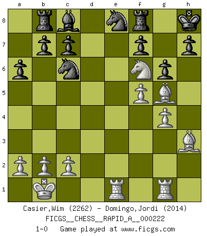 Last move : 1-0 2018 December 25 10:53:23 [Event "FICGS__CHESS__RAPID_A__000222"] [Site "FICGS"] [Date "2018.09.09"] [Round "1"] [White "Casier,Wim"] [Black "Domingo,Jordi"] [Result "1-0"] [WhiteElo "2262"] [BlackElo "2014"] 1.e4 e5 2.Nf3 d6 3.d4 Nf6 4.dxe5 Nxe4 5.Qd5 Nc5 6.Bg5 Qd7 7.exd6 Bxd6 8.Nc3 Qe6+ 9.Be3 Qxd5 10.Nxd5 Ne6 11.O-O-O O-O 12.Nh4 g6 13.Bh6 Rd8 14.f4 Nc6 15.f5 Ng7 16.g4 Kh8 17.Bh3 Re8 18.Rhf1 Nb4 19.Nc3 Nc6 20.Nb5 Bxh2 21.Nf3 Bg3 22.Rg1 a6 23.Nc3 Bd6 24.Nd5 Rb8 25.Ng5 Rf8 26.Nf6 Bf4+ 27.Kb1 Bxg5 28.Bxg5 Ne8 29.Rde1 1-0 Philidor : Nimzovich, Rellstab variation Queenside Castling by player White (move 11) Kingside Castling by player Black (move 11) Player White won this chess game. Follow this game move after move (download)Chess is a cold bath for the mind. (Sir John Simon) Ein Isolani verdüstert die Stimmung auf dem ganzen Schachbrett. (Savielly Grigorievitsch Tartakower) Preferería tener un Peón que un dedo. (Reuben Fine) Dans le domaine de la peinture, de la gravure et de la sculpture, dès la première décennie de notre siècle, les artistes abandonnent la représentation de la partie d'échecs pour se concentrer sur les pièces, sur les échiquiers et sur toutes les variations auxquelles les unes et les autres peuvent donner lieu. On passe en quelque sorte d'un thème social à un thème musical (au sens de la musica médiévale, c'est-à-dire d'une notion qui inclue le rythme, l'harmonie, la construction et la déconstruction, etc.). Graphiquement et picturalement, l'échiquier apparaît comme une structure ouverte, dynamique, d'une richesse infinie, autorisant toutes les combinatoires et débouchant sur des mouvements et des rythmes de nature exponentielle. (Michel Pastoureau) Unless in communicating with it one says exactly what one means, trouble is bound to result. (Alan Turing, about computers)
