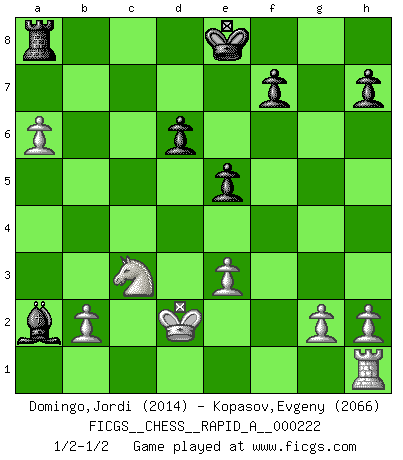 Last move : 1/2-1/2 2018 December 5 13:6:34 [Event "FICGS__CHESS__RAPID_A__000222"] [Site "FICGS"] [Date "2018.09.09"] [Round "1"] [White "Domingo,Jordi"] [Black "Kopasov,Evgeny"] [Result "1/2-1/2"] [WhiteElo "2014"] [BlackElo "2066"] 1.e4 c5 2.Nf3 Nc6 3.d4 cxd4 4.Nxd4 Nf6 5.Nc3 e5 6.Ndb5 d6 7.Bg5 a6 8.Na3 b5 9.Nd5 Be7 10.Nxe7 Nxe7 11.Bxf6 gxf6 12.c4 f5 13.exf5 Nxf5 14.cxb5 Nd4 15.Rc1 Rg8 16.Rc3 Rg4 17.bxa6 Re4+ 18.Re3 Rxe3+ 19.fxe3 Qh4+ 20.Kd2 Qf2+ 21.Be2 Nxe2 22.Qxe2 Qxe2+ 23.Kxe2 Be6 24.Nb1 Bc4+ 25.Kd2 Bxa2 26.Nc3 1/2-1/2 Sicilian : Pelikan (Lasker/Sveshnikov) variation This chess game ended in a draw. Follow this game move after move (download)Spassky will not be psyched out by Fischer. (Mike Goodall) Ein Springer auf f6 gegen die eigene Rochadestellung ist schlimmer als ein rostiger Nagel im Knie. (Efim Bogoljubov) En el tablero, la mentira e hipocresía no sobreviven mucho. (Emanuel Lasker) Nous sommes les pions de la mystérieuse partie d'Echecs jouée par Dieu. Il nous déplace, nous arrête, nous pousse encore, puis nous lance un à un dans la boîte du Néant. Epitaphe sur la tombe de David Janowsky (1868-1927). Don't be irreplaceable, if you can't be replaced, you can't be promoted. (Dan Rotaru)