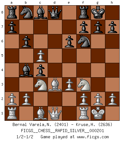 Last move : 1/2-1/2 2018 September 17 23:20:3 [Event "FICGS__CHESS__RAPID_SILVER__000201"] [Site "FICGS"] [Date "2018.09.10"] [Round "2"] [White "Bernal Varela,Nelson"] [Black "Kruse,Herbert"] [Result "1/2-1/2"] [WhiteElo "2401"] [BlackElo "2636"] 1.d4 Nf6 2.c4 e6 3.Nc3 Bb4 4.e3 O-O 5.Bd3 d5 6.Nf3 c5 7.O-O b6 8.dxc5 dxc4 1/2-1/2 Nimzo-Indian : 4.e3 O-O, 5.Bd3 d5 Kingside Castling by player Black (move 4) Kingside Castling by player White (move 7) This chess game ended in a draw. Follow this game move after move (download)Though most people love to look at the games of the great attacking masters, some of the most successful players in history have been the quiet positional players. They slowly grind you down by taking away your space, tying up your pieces, and leaving you with virtually nothing to do ! (Yasser Seirawan) Ein Buch ist ein Spiegel; wenn ein Affe hineinsieht, so kann kein Apostel heraus gucken. (Georg Christoph Lichtenberg) Cada Peón es una Reina en potencia. (James Mason) Le succès, c'est être capable d'aller d'échec en échec sans perdre son enthousiasme. (Winston Churchill) Good decisions come from experience, and experience comes from bad decisions. (Anonymous)