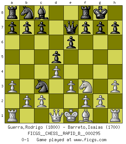 Last move : 0-1 2018 October 28 9:7:21 [Event "FICGS__CHESS__RAPID_B__000295"] [Site "FICGS"] [Date "2018.09.10"] [Round "1"] [White "Guerra,Rodrigo"] [Black "Barreto,Isaias"] [Result "0-1"] [WhiteElo "1800"] [BlackElo "1700"] 1.Nf3 d5 2.d4 Nf6 3.h3 e6 4.Bg5 Be7 5.a3 Ne4 6.Bxe7 Qxe7 7.e3 O-O 8.Nc3 Nxc3 0-1 This chess game has been lost on time (started : 2018.09.10 10:48:56) Reti Opening Kingside Castling by player Black (move 7) Player Black won this chess game. Follow this game move after move (download)The winner of the game is the player who makes the next-to-last mistake. (Savielly Tartakover) Der Bart als Geschlechtszeichen mitten im Gesicht ist obszön. Daher gefällt er den Weibern. [Zugegeben, kein Schachzitat, aber unglaublich originell] (Arthur Schopenhauer) El Ajedrez es la vida. (Bobby Fischer) Même un GMI sait rarement calculer sur plus de cinq coups une attaque à sacrifices. (Rudolf Spielmann) For a mechanic, you seem to do an excessive amount of thinking. (C-3PO in Star Wars ep.2)
