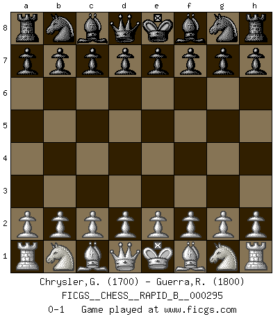 Last move : 0-1 2018 October 10 19:29:7 [Event "FICGS__CHESS__RAPID_B__000295"] [Site "FICGS"] [Date "2018.09.10"] [Round "1"] [White "Chrysler,Gwendolynn"] [Black "Guerra,Rodrigo"] [Result "0-1"] [WhiteElo "1700"] [BlackElo "1800"] 0-1 This chess game has been lost on time (started : 2018.09.10 10:48:56) Player Black won this chess game. Follow this game move after move (download)Every Pawn is a potential Queen. (James Mason) Ein Schachspiel besteht aus drei Phasen: Die erste, wenn du hofftst den Vorteil zu haben, die zweite, wenn du glaubst einen Vorteil zu haben, und die dritte.... wenn du weißt Du wirst verlieren. (Savielly Grigorievitsch Tartakower) Solo puedes ser bueno en el Ajedrez si amas al juego. (Bobby Fischer) Les échecs sont plus proches de l'art de l'assassinat que de l'art de la guerre. (Arturo Perez-Reverte) Dave, my mind is going. I can feel it. (HAL 9000 in 2001, a space odyssey)