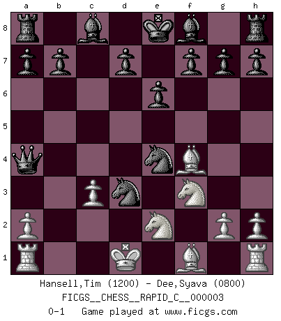 Last move : 0-1 2006 July 13 17:18:14 [Event "FICGS__CHESS__RAPID_C__000003"] [Site "FICGS"] [Date "2006.06.08"] [Round "1"] [White "Hansell,Tim"] [Black "Dee,Syava"] [Result "0-1"] [WhiteElo "1200"] [BlackElo "0800"] 1.e4 c5 2.Nc3 e6 3.d4 cxd4 4.Nce2 Nf6 5.Qxd4 Nc6 6.Qe5 Nxe5 7.Bf4 Qa5 8.c3 Nd3 9.Kd2 Nxf2 10.Nf3 N6xe4 11.Ke1 Nfd3 12.Kd1 Nxb2 13.Ke1 Nd3 14.Kd1 Qa4 0-1 Sicilian : Closed Player Black won this chess game. Follow this game move after move (download)The game of chess is the touchstone of the intellect. (Goethe) Ich erzeugte keinen Neid, da mich die Schachspieler als Musiker und die Musiker als Schachspieler betrachteten. (Mark Taimanov) El Ajedrez hace al hombre ser mas sabio y ver mas claro. (Vladimir Putin) Tous ces prétendus hommes politiques sont les pions, les Cavaliers, les Tours ou les Fous d'une partie d'échecs qui se jouera tant qu'un hasard ne renversera pas l'échiquier. (Honoré de Balzac) I just play for fun. (Anna Kournikova)