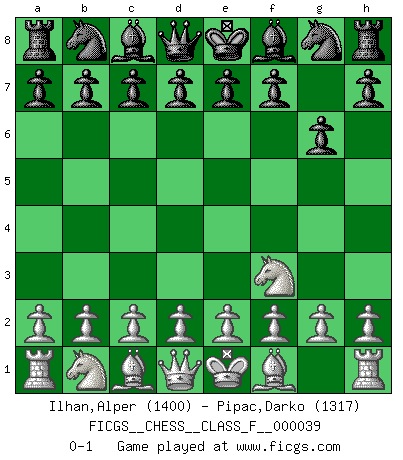 Last move : 0-1 2007 June 30 15:23:12 [Event "FICGS__CHESS__CLASS_F__000039"] [Site "FICGS"] [Date "2007.05.18"] [Round "1"] [White "Ilhan,Alper"] [Black "Pipac,Darko"] [Result "0-1"] [WhiteElo "1400"] [BlackElo "1317"] 1.Nf3 g6 0-1 This chess game has been lost on time (started : 2007.05.18 8:47:38) Reti Opening Player Black won this chess game. Follow this game move after move (download)A chess genius has died; a loss for humanity. (Viktor Kortchnoi, about Bobby Fischer's death) In Buenos Aires ist es nicht mein vorrangiges Ziel ein starkes Turnier zu organisieren, sondern ein Turnier für Gentlemen. Ich würde nie Kamsky einladen. Ich mag keine Probleme. (Miguel Najdorf) La maestría del Ajedrez consiste esencialmente en analizar posiciónes de Ajedrez con precisión. (Mikhail Botvinnik) Toutes les manuvres exécutées sur une colonne ouverte ont pour but ultime l'intrusion définitive sur la septième ou la huitième rangée, en plein cur de la position ennemie. (Aaron Nimzovitch) The Movers & Shakers of this world are those who play chess in the mornings and go to the disco in the evenings. (Dinesh De Silva)